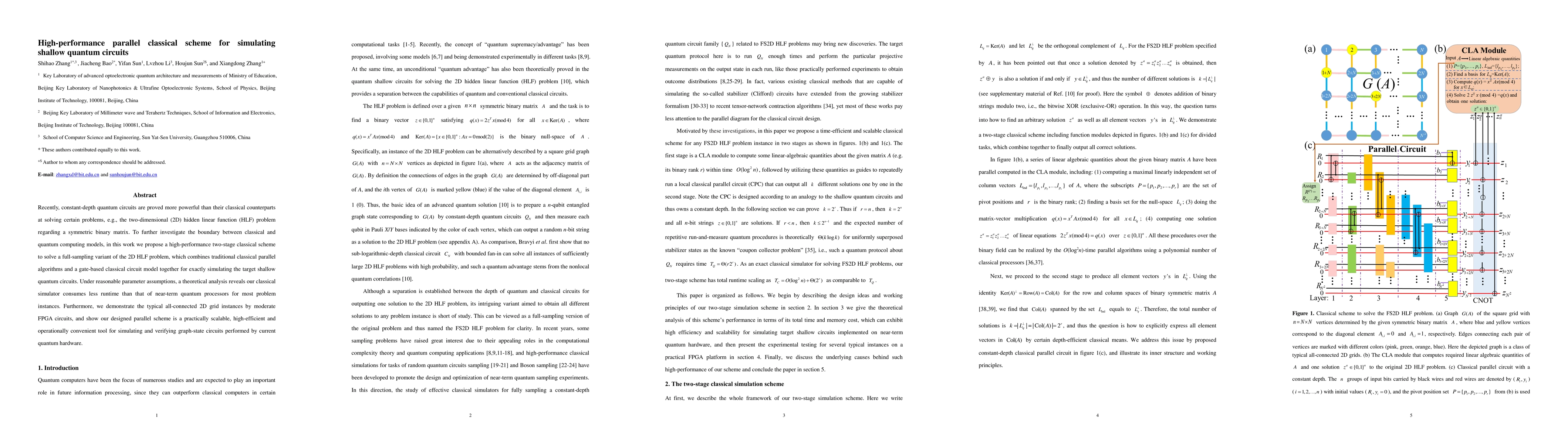 The research proposes a high-performance two-stage classical scheme combining traditional parallel algorithms and a gate-based classical circuit model for simulating shallow quantum circuits.
