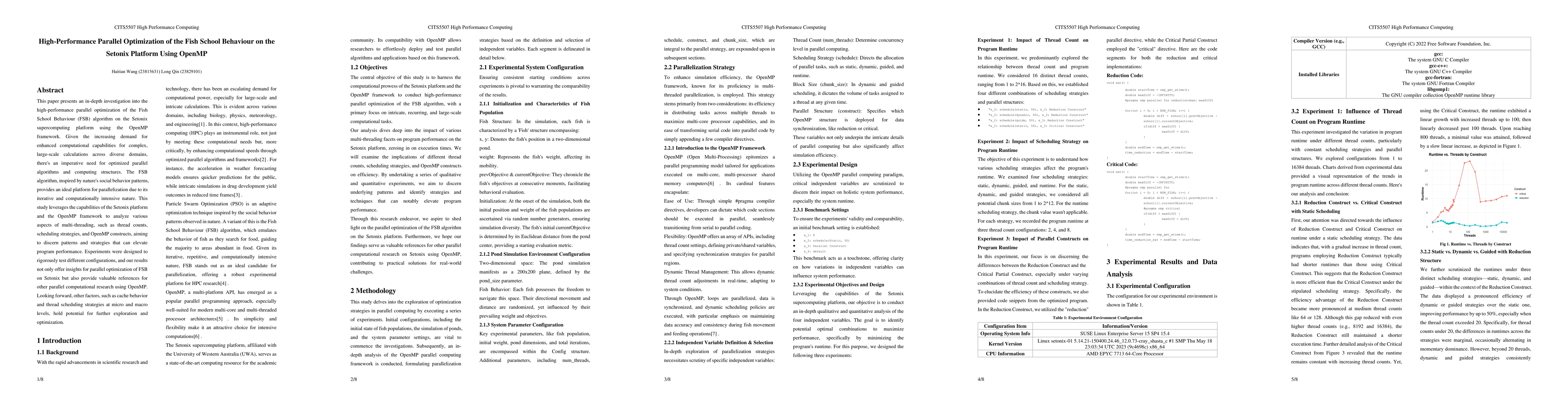 This paper presents an in-depth investigation into the high-performance parallel optimization of the Fish School Behaviour (FSB) algorithm on the Setonix supercomputing platform using the OpenMP framework. Given the increasing demand for enhanced computational capabilities for complex, large-scale calculations across diverse domains, there's an imperative need for optimized parallel algorithms and computing structures. The FSB algorithm, inspired by nature's social behavior patterns, provides an ideal platform for parallelization due to its iterative and computationally intensive nature. This study leverages the capabilities of the Setonix platform and the OpenMP framework to analyze various aspects of multi-threading, such as thread counts, scheduling strategies, and OpenMP constructs, aiming to discern patterns and strategies that can elevate program performance. Experiments were designed to rigorously test different configurations, and our results not only offer insights for parallel optimization of FSB on Setonix but also provide valuable references for other parallel computational research using OpenMP. Looking forward, other factors, such as cache behavior and thread scheduling strategies at micro and macro levels, hold potential for further exploration and optimization.