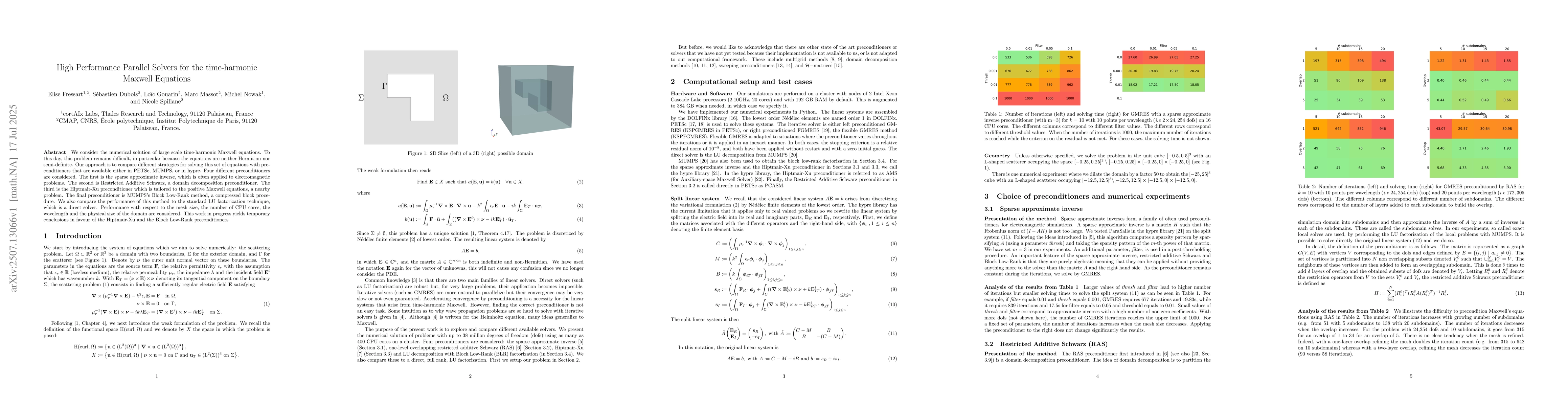 We consider the numerical solution of large scale time-harmonic Maxwell equations. To this day, this problem remains difficult, in particular because the equations are neither Hermitian nor semi-definite. Our approach is to compare different strategies for solving this set of equations with preconditioners that are available either in PETSc, MUMPS, or in hypre. Four different preconditioners are considered. The first is the sparse approximate inverse, which is often applied to electromagnetic problems. The second is Restricted Additive Schwarz, a domain decomposition preconditioner. The third is the Hiptmair-Xu preconditioner which is tailored to the positive Maxwell equations, a nearby problem. The final preconditioner is MUMPS's Block Low-Rank method, a compressed block procedure. We also compare the performance of this method to the standard LU factorization technique, which is a direct solver. Performance with respect to the mesh size, the number of CPU cores, the wavelength and the physical size of the domain are considered. This work in progress yields temporary conclusions in favour of the Hiptmair-Xu and the Block Low-Rank preconditioners.