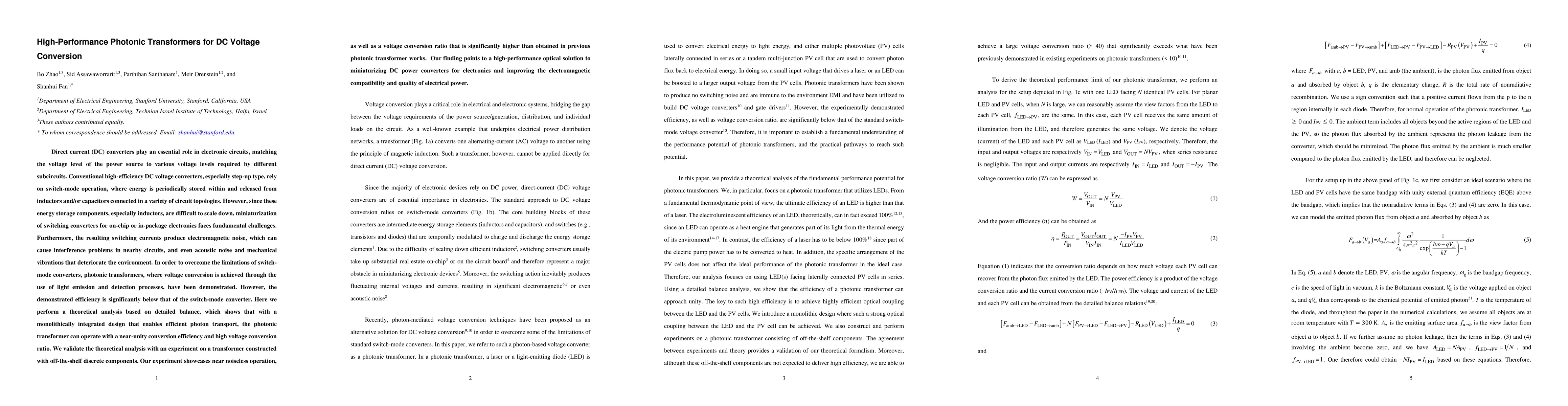 This paper presents a theoretical and experimental analysis of high-performance photonic transformers for DC voltage conversion, demonstrating near-unity efficiency and significantly higher voltage conversion ratios compared to previous works. The proposed solution aims to address the miniaturization and electromagnetic interference challenges of conventional switch-mode DC converters.