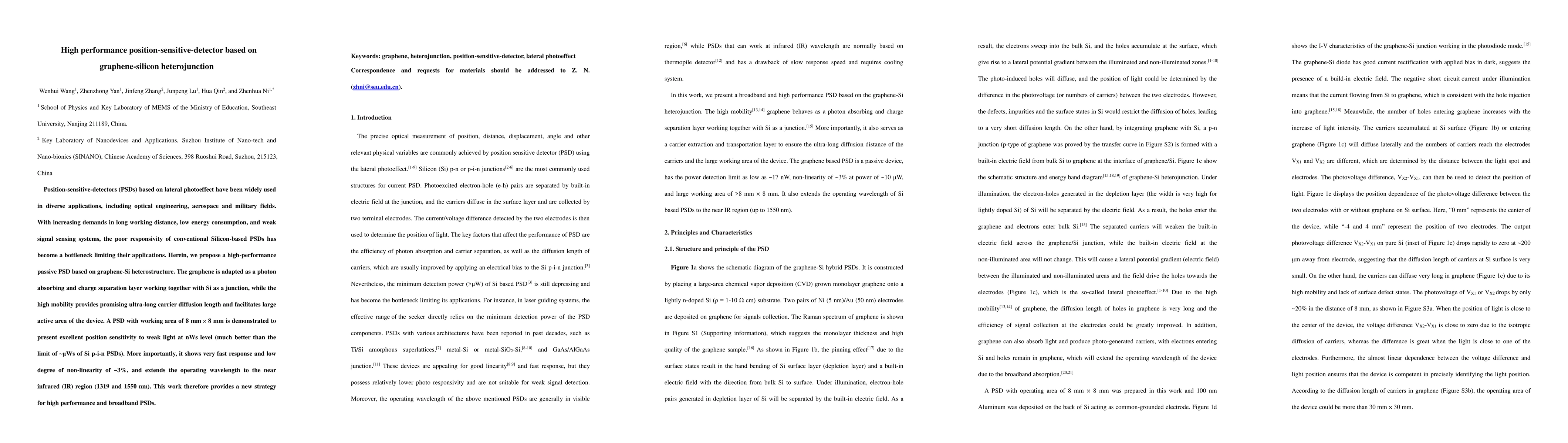 This paper proposes a high-performance position-sensitive detector based on a graphene-silicon heterostructure, demonstrating superior responsivity, fast response, and extended near-infrared wavelength operation compared to conventional silicon-based PSDs. The device shows excellent position sensitivity to weak light signals and a low degree of non-linearity.