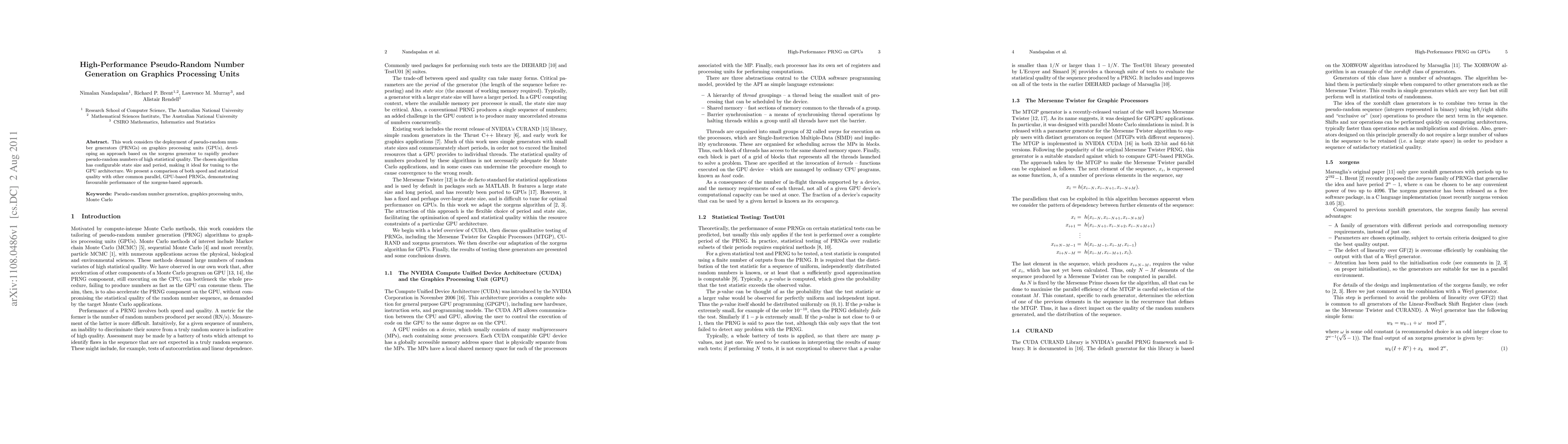 This paper explores the use of the xorgens pseudo-random number generator on GPUs to achieve high-speed and statistically superior random number generation. The study compares the performance of xorgens with other parallel GPU-based PRNGs, showing its favorable speed and statistical quality.