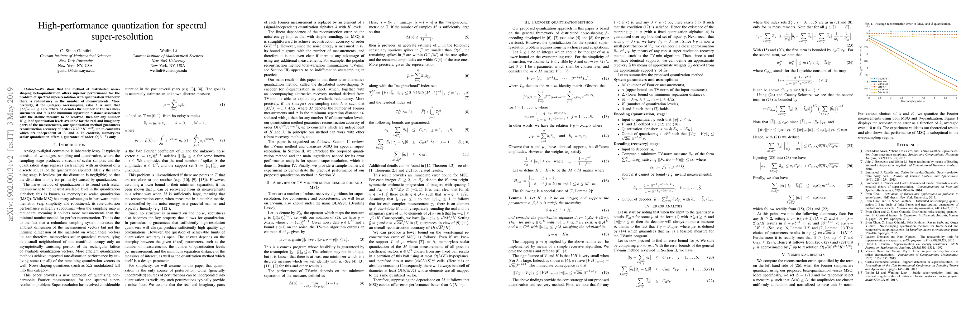 We show that the method of distributed noise-shaping beta-quantization offers superior performance for the problem of spectral super-resolution with quantization whenever there is redundancy in the number of measurements. More precisely, if the (integer) oversampling ratio $\lambda$ is such that $\lfloor M/\lambda\rfloor - 1\geq 4/\Delta$, where $M$ denotes the number of Fourier measurements and $\Delta$ is the minimum separation distance associated with the atomic measure to be resolved, then for any number $K\geq 2$ of quantization levels available for the real and imaginary parts of the measurements, our quantization method guarantees reconstruction accuracy of order $O(\lambda K^{- \lambda/2})$, up to constants which are independent of $K$ and $\lambda$. In contrast, memoryless scalar quantization offers a guarantee of order $O(K^{-1})$ only.