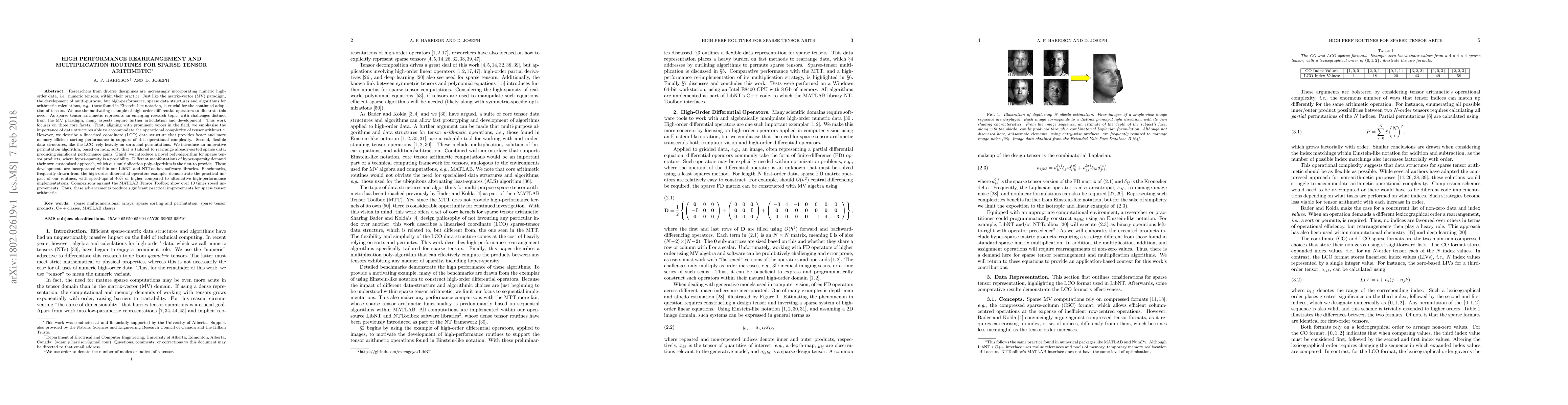 Researchers are increasingly incorporating numeric high-order data, i.e., numeric tensors, within their practice. Just like the matrix/vector (MV) paradigm, the development of multi-purpose, but high-performance, sparse data structures and algorithms for arithmetic calculations, e.g., those found in Einstein-like notation, is crucial for the continued adoption of tensors. We use the example of high-order differential operators to illustrate this need. As sparse tensor arithmetic is an emerging research topic, with challenges distinct from the MV paradigm, many aspects require further articulation. We focus on three core facets. First, aligning with prominent voices in the field, we emphasise the importance of data structures able to accommodate the operational complexity of tensor arithmetic. However, we describe a linearised coordinate (LCO) data structure that provides faster and more memory-efficient sorting performance. Second, flexible data structures, like the LCO, rely heavily on sorts and permutations. We introduce an innovative permutation algorithm, based on radix sort, that is tailored to rearrange already-sorted sparse data, producing significant performance gains. Third, we introduce a novel poly-algorithm for sparse tensor products, where hyper-sparsity is a possibility. Different manifestations of hyper-sparsity demand their own approach, which our poly-algorithm is the first to provide. These developments are incorporated within our LibNT and NTToolbox software libraries. Benchmarks, frequently drawn from the high-order differential operators example, demonstrate the practical impact of our routines, with speed-ups of 40% or higher compared to alternative high-performance implementations. Comparisons against the MATLAB Tensor Toolbox show over 10 times speed improvements. Thus, these advancements produce significant practical improvements for sparse tensor arithmetic.
