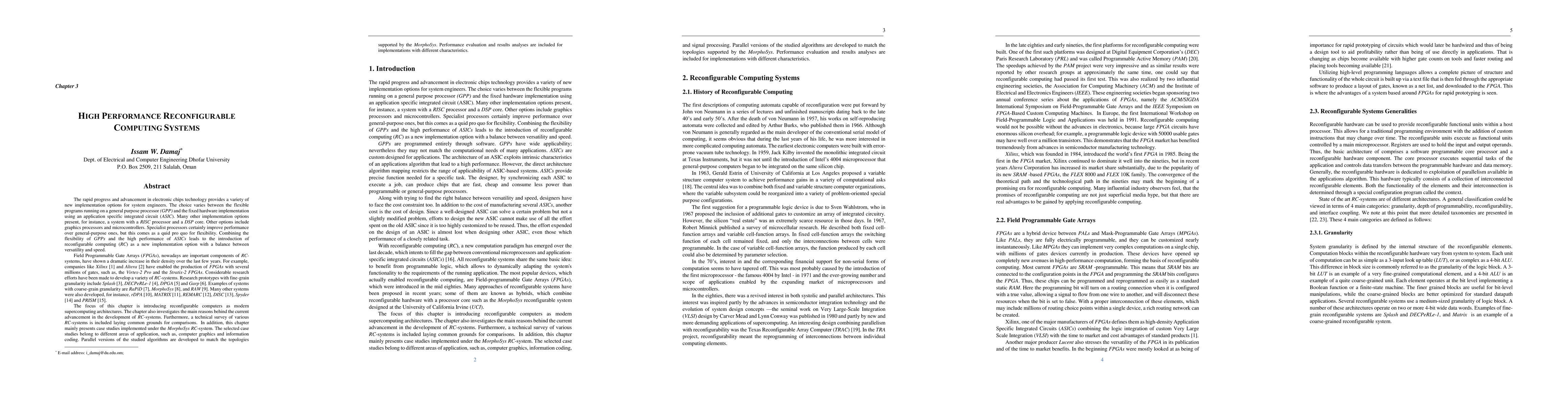 The rapid progress and advancement in electronic chips technology provide a variety of new implementation options for system engineers. The choice varies between the flexible programs running on a general-purpose processor (GPP) and the fixed hardware implementation using an application specific integrated circuit (ASIC). Many other implementation options present, for instance, a system with a RISC processor and a DSP core. Other options include graphics processors and microcontrollers. Specialist processors certainly improve performance over general-purpose ones, but this comes as a quid pro quo for flexibility. Combining the flexibility of GPPs and the high performance of ASICs leads to the introduction of reconfigurable computing (RC) as a new implementation option with a balance between versatility and speed. The focus of this chapter is on introducing reconfigurable computers as modern super computing architectures. The chapter also investigates the main reasons behind the current advancement in the development of RC-systems. Furthermore, a technical survey of various RC-systems is included laying common grounds for comparisons. In addition, this chapter mainly presents case studies implemented under the MorphoSys RC-system. The selected case studies belong to different areas of application, such as, computer graphics and information coding. Parallel versions of the studied algorithms are developed to match the topologies supported by the MorphoSys. Performance evaluation and results analyses are included for implementations with different characteristics.