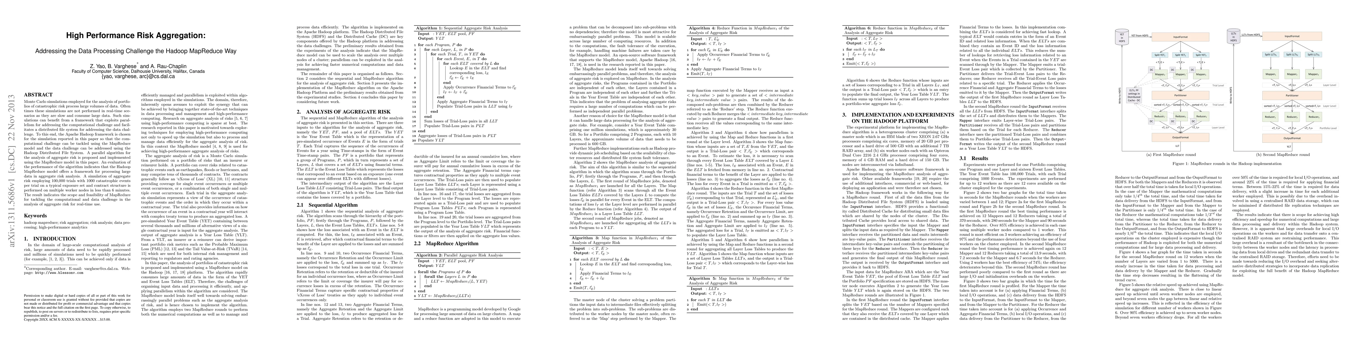 This paper proposes a parallel algorithm for Monte Carlo simulations to analyze catastrophic risk portfolios using the Hadoop MapReduce framework. The evaluation demonstrates that the Hadoop MapReduce model effectively processes large data volumes, achieving a 100,000 trial simulation in under 6 minutes, showcasing its feasibility for real-time risk aggregation.
