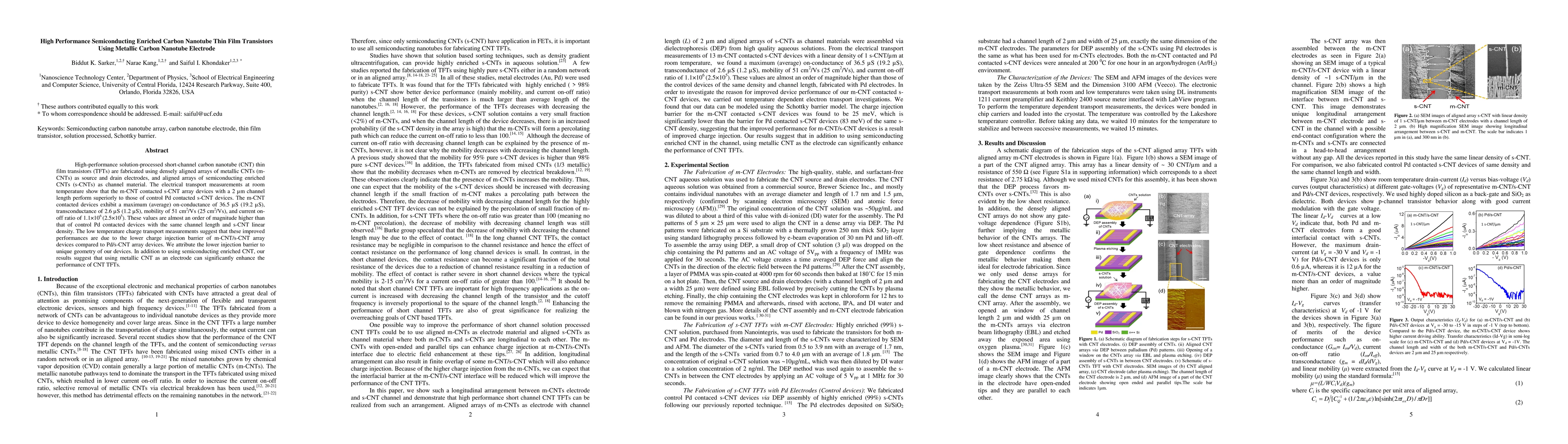 This paper reports the fabrication of high-performance carbon nanotube thin film transistors using metallic CNTs as electrodes and semiconducting enriched CNTs as the channel material. The devices show significantly improved performance metrics compared to control devices, attributed to lower charge injection barriers due to the unique geometry of the metallic CNT electrodes.