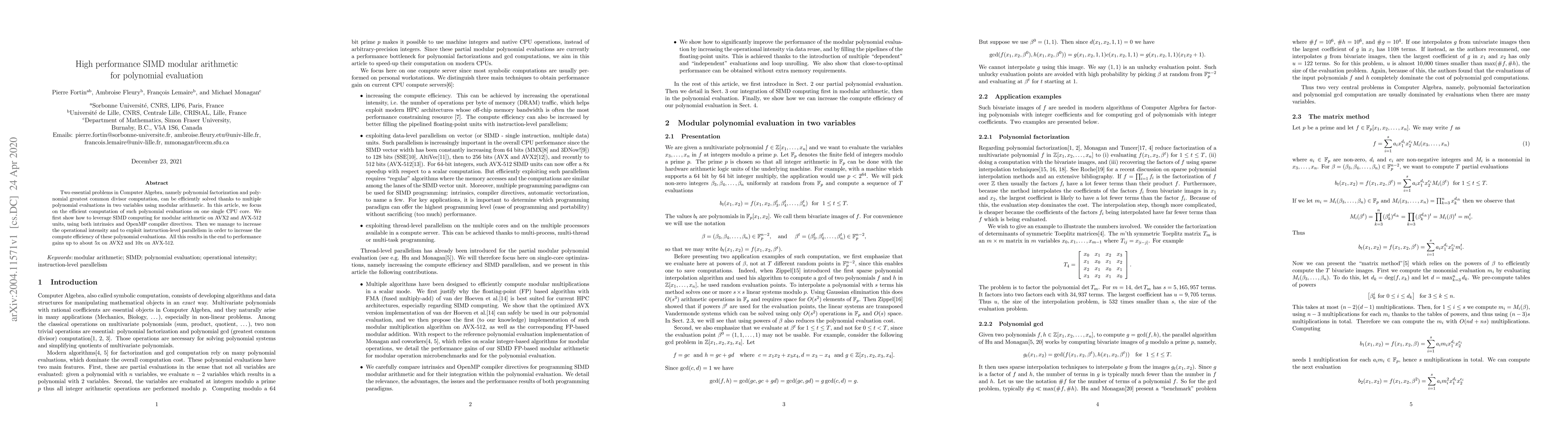 This paper explores the use of SIMD techniques, particularly leveraging AVX2 and AVX-512 instructions, to enhance the performance of modular arithmetic for polynomial evaluation in computer algebra, achieving up to 5x speedup on AVX2 and 10x on AVX-512 cores. The study focuses on increasing operational intensity and exploiting instruction-level parallelism for improved compute efficiency.