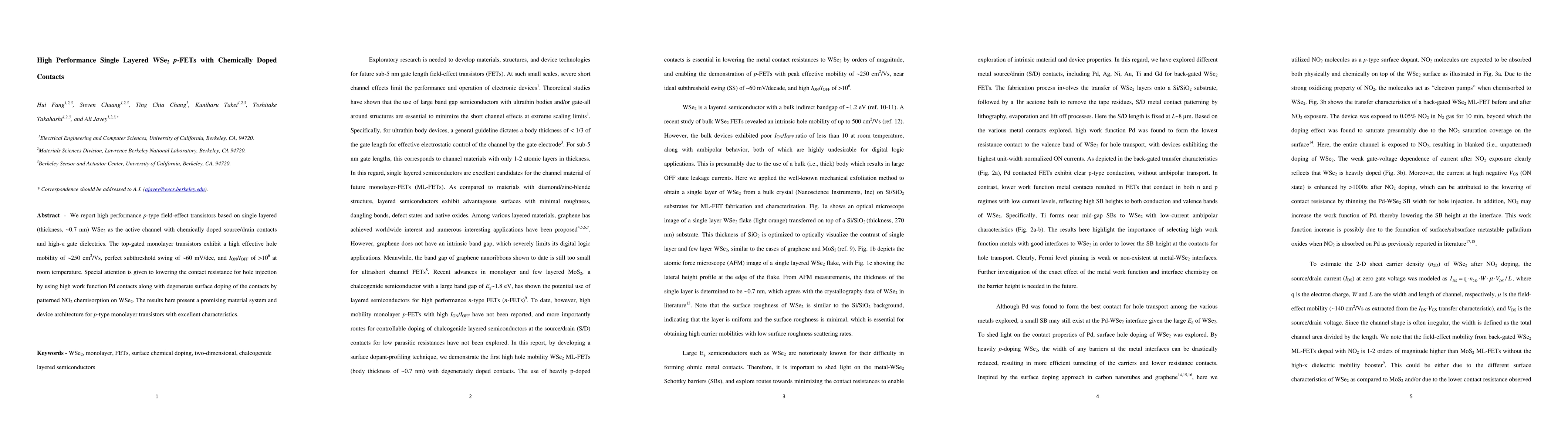 The paper reports high-performance p-type field-effect transistors utilizing single-layered WSe2, achieving high hole mobility, excellent subthreshold swing, and significant ON/OFF current ratio. Improved contact resistance is achieved through chemically doped Pd contacts and surface doping via NO2 chemisorption.