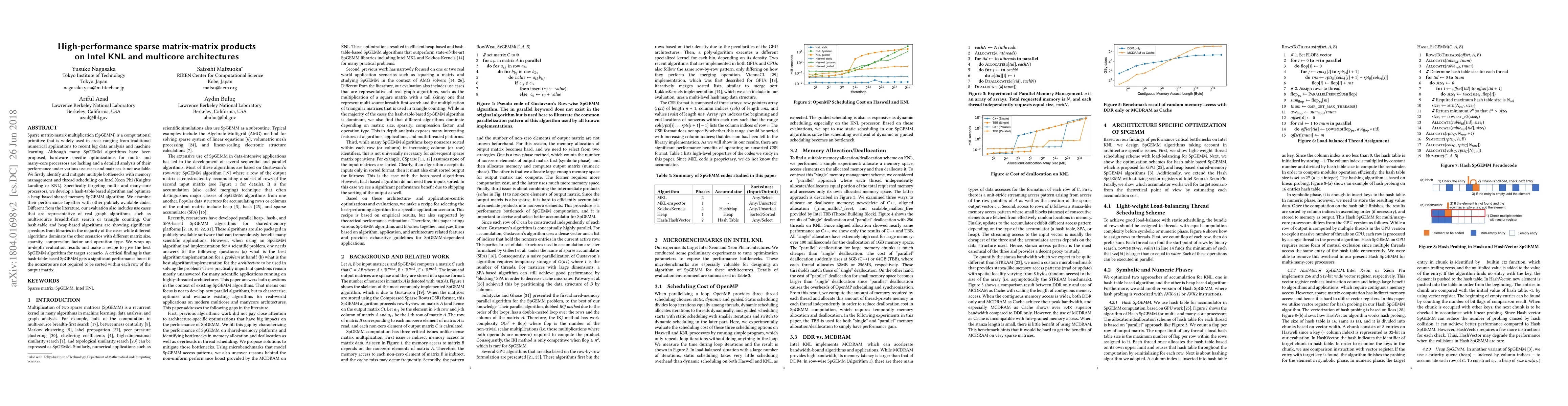 Sparse matrix-matrix multiplication (SpGEMM) is a computational primitive that is widely used in areas ranging from traditional numerical applications to recent big data analysis and machine learning. Although many SpGEMM algorithms have been proposed, hardware specific optimizations for multi- and many-core processors are lacking and a detailed analysis of their performance under various use cases and matrices is not available. We firstly identify and mitigate multiple bottlenecks with memory management and thread scheduling on Intel Xeon Phi (Knights Landing or KNL). Specifically targeting multi- and many-core processors, we develop a hash-table-based algorithm and optimize a heap-based shared-memory SpGEMM algorithm. We examine their performance together with other publicly available codes. Different from the literature, our evaluation also includes use cases that are representative of real graph algorithms, such as multi-source breadth-first search or triangle counting. Our hash-table and heap-based algorithms are showing significant speedups from libraries in the majority of the cases while different algorithms dominate the other scenarios with different matrix size, sparsity, compression factor and operation type. We wrap up in-depth evaluation results and make a recipe to give the best SpGEMM algorithm for target scenario. A critical finding is that hash-table-based SpGEMM gets a significant performance boost if the nonzeros are not required to be sorted within each row of the output matrix.