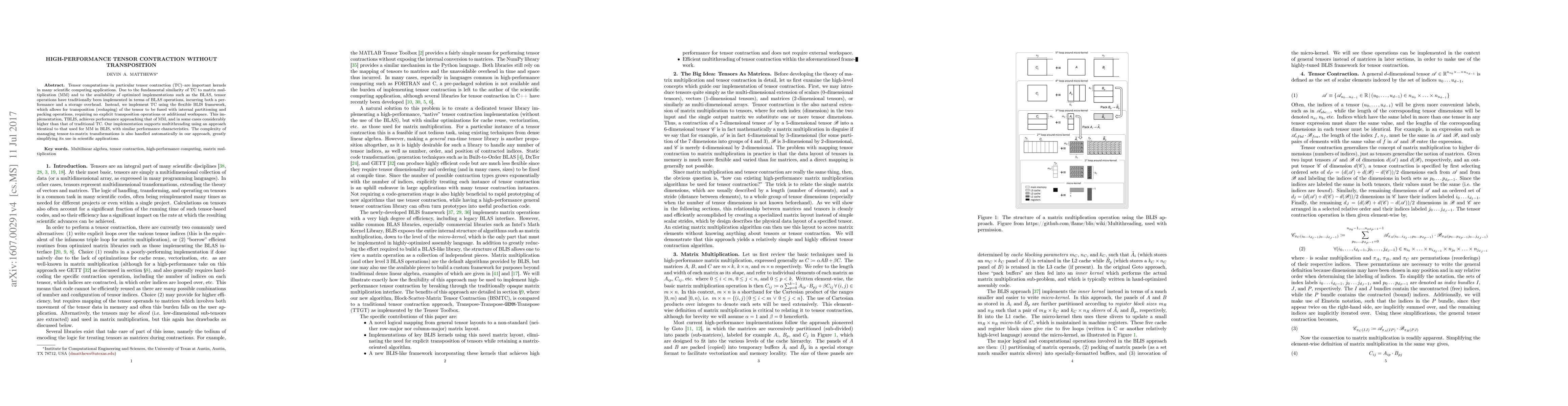 This paper presents TBLIS, a high-performance tensor contraction implementation using the BLIS framework, avoiding transposition and additional workspace, achieving performance comparable to matrix multiplication and simplifying tensor-to-matrix transformations. It supports multithreading with performance characteristics similar to BLIS.