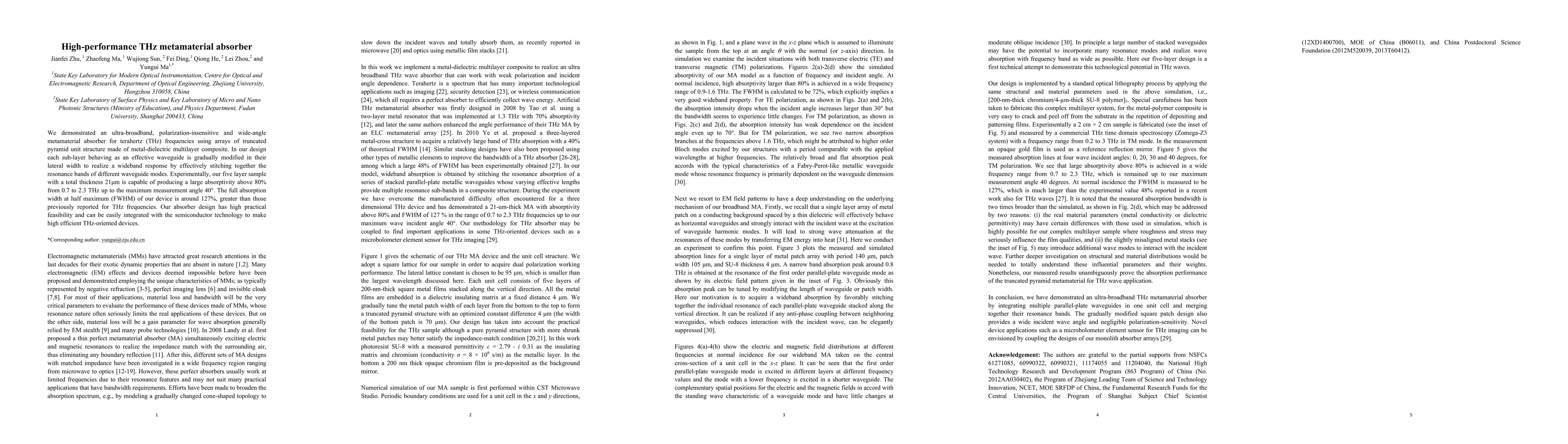 This research presents a highly efficient metamaterial absorber for terahertz frequencies, constructed from metal-dielectric multilayer composites. The design achieves over 80% absorptivity from 0.7 to 2.3 THz with wide-angle and polarization-insensitivity, demonstrating significant potential for integration into semiconductor technology.