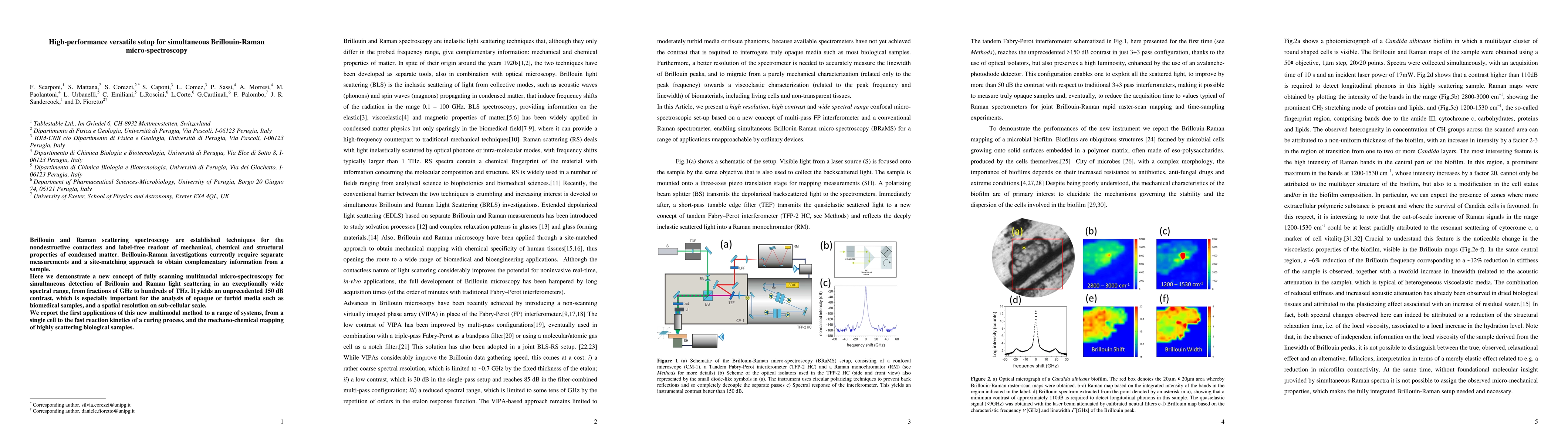 This paper introduces a high-performance setup for simultaneous Brillouin-Raman micro-spectroscopy, enabling the detection of both Brillouin and Raman scattering in a wide spectral range with exceptional contrast and sub-cellular resolution. The method is applied to various systems, demonstrating its utility in analyzing opaque and turbid media, including biological samples.