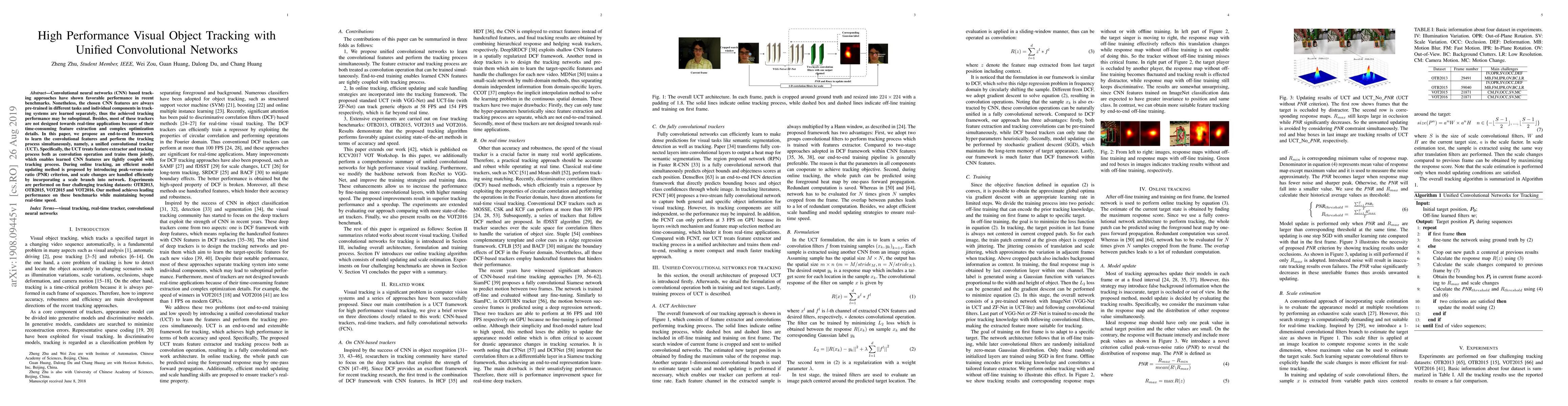 Convolutional neural networks (CNN) based tracking approaches have shown favorable performance in recent benchmarks. Nonetheless, the chosen CNN features are always pre-trained in different tasks and individual components in tracking systems are learned separately, thus the achieved tracking performance may be suboptimal. Besides, most of these trackers are not designed towards real-time applications because of their time-consuming feature extraction and complex optimization details. In this paper, we propose an end-to-end framework to learn the convolutional features and perform the tracking process simultaneously, namely, a unified convolutional tracker (UCT). Specifically, the UCT treats feature extractor and tracking process both as convolution operation and trains them jointly, which enables learned CNN features are tightly coupled with tracking process. During online tracking, an efficient model updating method is proposed by introducing peak-versus-noise ratio (PNR) criterion, and scale changes are handled efficiently by incorporating a scale branch into network. Experiments are performed on four challenging tracking datasets: OTB2013, OTB2015, VOT2015 and VOT2016. Our method achieves leading performance on these benchmarks while maintaining beyond real-time speed.