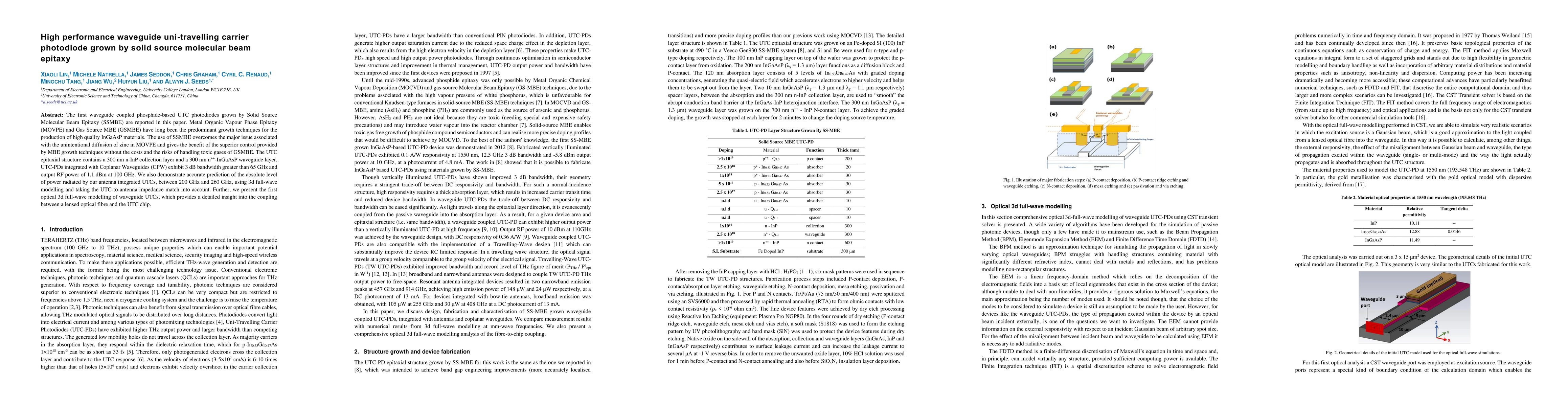The first waveguide coupled phosphide-based UTC photodiodes grown by Solid Source Molecular Beam Epitaxy (SSMBE) are reported in this paper. Metal Organic Vapour Phase Epitaxy (MOVPE) and Gas Source MBE (GSMBE) have long been the predominant growth techniques for the production of high quality InGaAsP materials. The use of SSMBE overcomes the major issue associated with the unintentional diffusion of zinc in MOVPE and gives the benefit of the superior control provided by MBE growth techniques without the costs and the risks of handling toxic gases of GSMBE. The UTC epitaxial structure contains a 300 nm n-InP collection layer and a 300 nm n++-InGaAsP waveguide layer. UTC-PDs integrated with Coplanar Waveguides (CPW) exhibit 3 dB bandwidth greater than 65 GHz and output RF power of 1.1 dBm at 100 GHz. We also demonstrate accurate prediction of the absolute level of power radiated by our antenna integrated UTCs, between 200 GHz and 260 GHz, using 3d full-wave modelling and taking the UTC-to-antenna impedance match into account. Further, we present the first optical 3d full-wave modelling of waveguide UTCs, which provides a detailed insight into the coupling between a lensed optical fibre and the UTC chip.