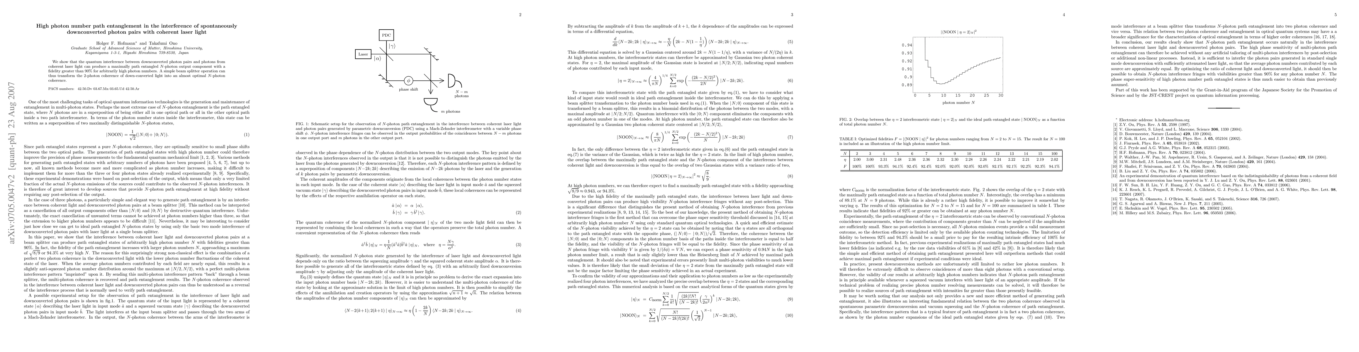 This paper demonstrates the generation of high photon number path entanglement through the interference of spontaneously downconverted photon pairs with coherent laser light, achieving a fidelity over 90% for large photon numbers. A beam splitter effectively converts the 2-photon coherence of down-converted light into near-optimal N-photon coherence.