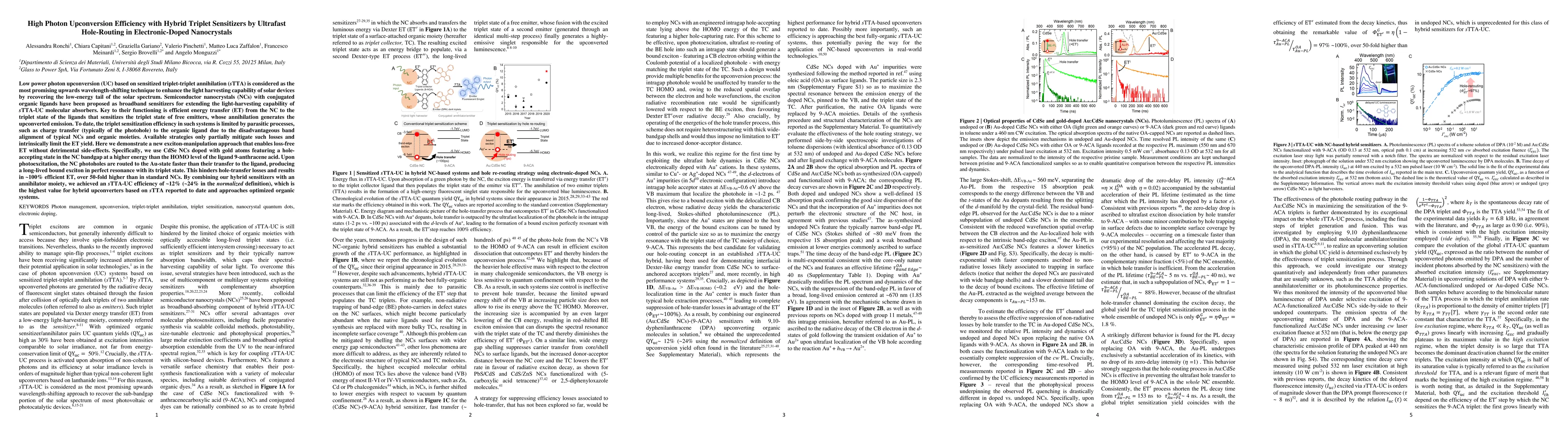 Low power photon upconversion (UC) based on sensitized triplet-triplet annihilation (sTTA) is considered as the most promising upwards wavelength-shifting technique to enhance the light harvesting capability of solar devices by recovering the low-energy tail of the solar spectrum. Semiconductor nanocrystals (NCs) with conjugated organic ligands have been proposed as broadband sensitizers for extending the light-harvesting capability of sTTA-UC molecular absorbers. Key to their functioning is efficient energy transfer (ET) from the NC to the triplet state of the ligands that sensitizes the triplet state of free emitters, whose annihilation generates the upconverted emission. To date, the triplet sensitization efficiency in such systems is limited by parasitic processes, such as charge transfer (typically of the photohole) to the organic ligand due to the disadvantageous band alignment of typical NCs and organic moieties. Available strategies only partially mitigate such losses and intrinsically limit the ET yield. Here we demonstrate a new exciton-manipulation approach that enables loss-free ET without detrimental side-effects. Specifically, we use CdSe NCs doped with gold atoms featuring a hole-accepting state in the NC bandgap at a higher energy than the HOMO level of the ligand 9-anthracene acid. Upon photoexcitation, the NC photoholes are routed to the Au-state faster than their transfer to the ligand, producing a long-lived bound exciton in perfect resonance with its triplet state. This hinders hole-transfer losses and results in ~100% efficient ET, over 50-fold higher than in standard NCs. By combining our hybrid sensitizers with an annihilator moiety, we achieved an sTTA-UC efficiency of ~12% (~24% in the normalized definition), which is the highest value for hybrid upconverters based on sTTA reported to date and approaches optimized organic systems.