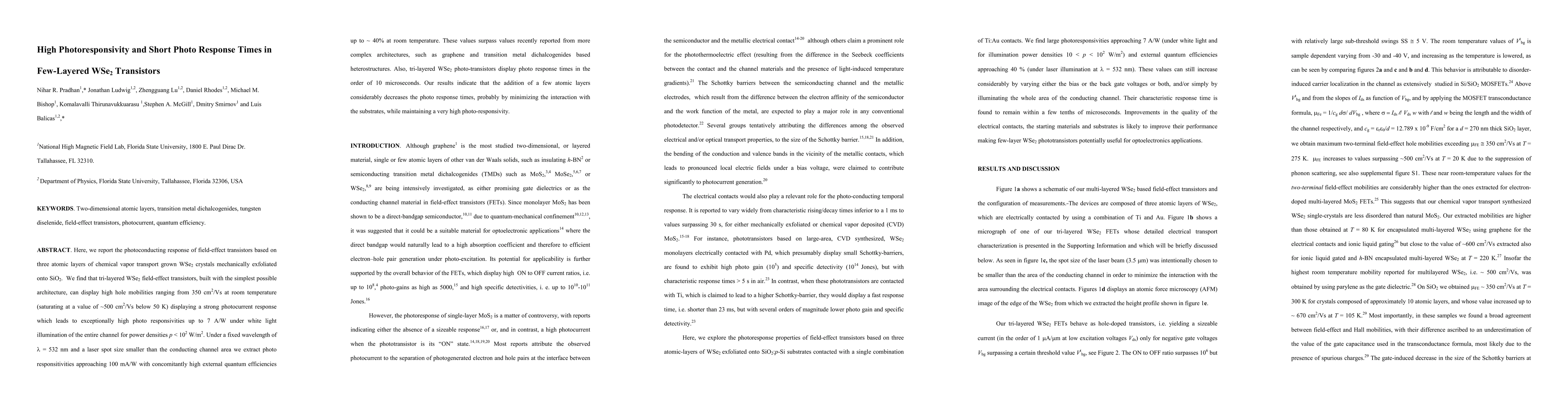 This study demonstrates high photoresponsivity and fast photo response times in tri-layered WSe$_2$ field-effect transistors, achieving up to 7 A/W under white light and 100 mA/W at 532 nm, with quantum efficiencies up to 40%. The short response times of 10 microseconds suggest reduced substrate interaction in few-layered structures.