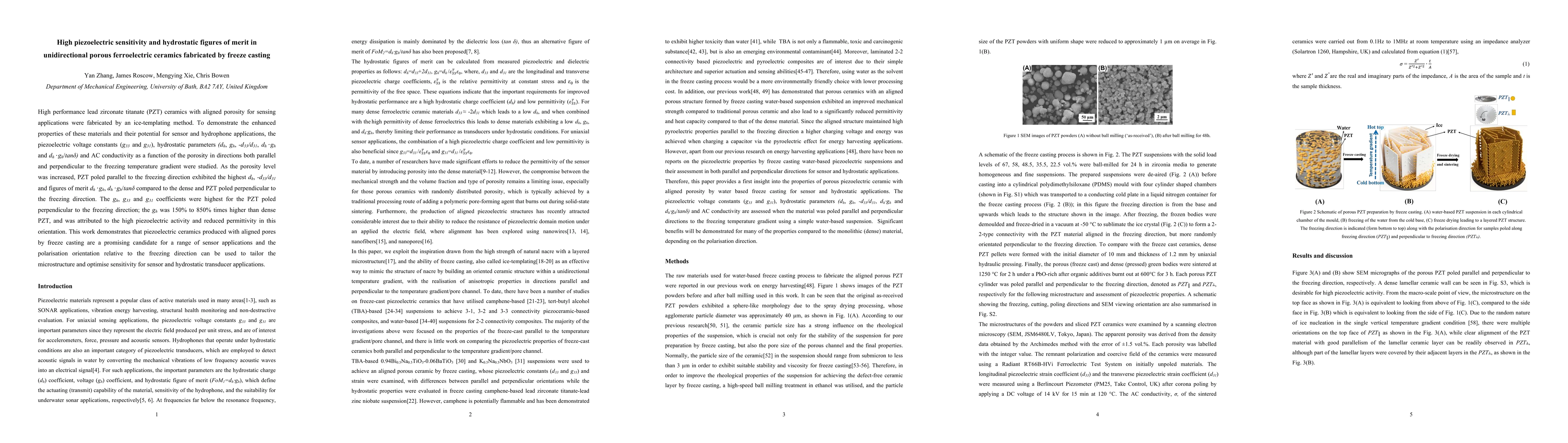 This research presents a novel method using ice-templating to create high-performance PZT ceramics with aligned porosity, enhancing piezoelectric sensitivity and hydrostatic figures of merit for sensing and hydrophone applications. The study demonstrates that polarization orientation relative to the freezing direction can be tailored to optimize ceramic sensitivity for various sensor uses.