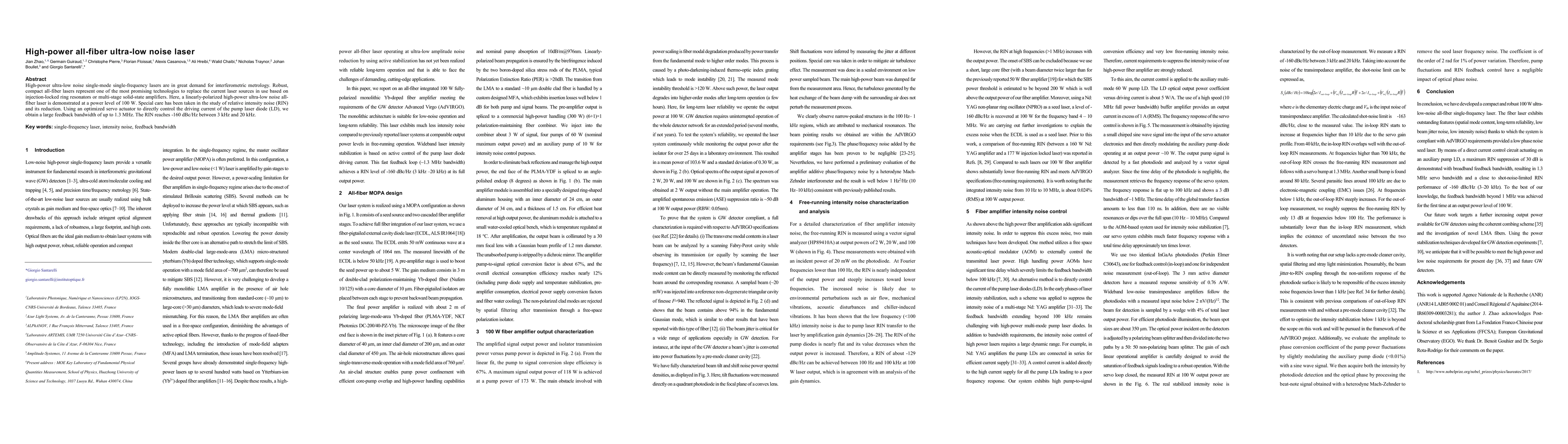 This paper demonstrates a 100 W high-power, ultra-low noise all-fiber laser designed for interferometric metrology, achieving a relative intensity noise (RIN) of -160 dBc/Hz between 3 kHz and 20 kHz through optimized current control of the pump laser diode. The compact, robust design promises to replace existing laser technologies.