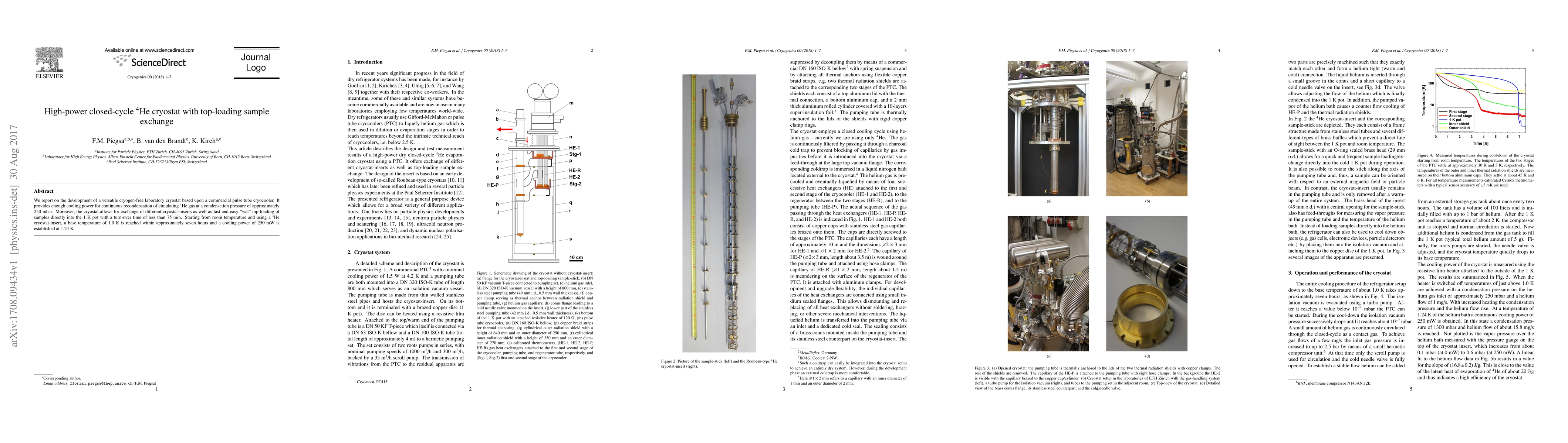We report on the development of a versatile cryogen-free laboratory cryostat based upon a commercial pulse tube cryocooler. It provides enough cooling power for continuous recondensation of circulating $^4$He gas at a condensation pressure of approximately 250~mbar. Moreover, the cryostat allows for exchange of different cryostat-inserts as well as fast and easy "wet" top-loading of samples directly into the 1 K pot with a turn-over time of less than 75~min. Starting from room temperature and using a $^4$He cryostat-insert, a base temperature of 1.0~K is reached within approximately seven hours and a cooling power of 250~mW is established at 1.24~K.