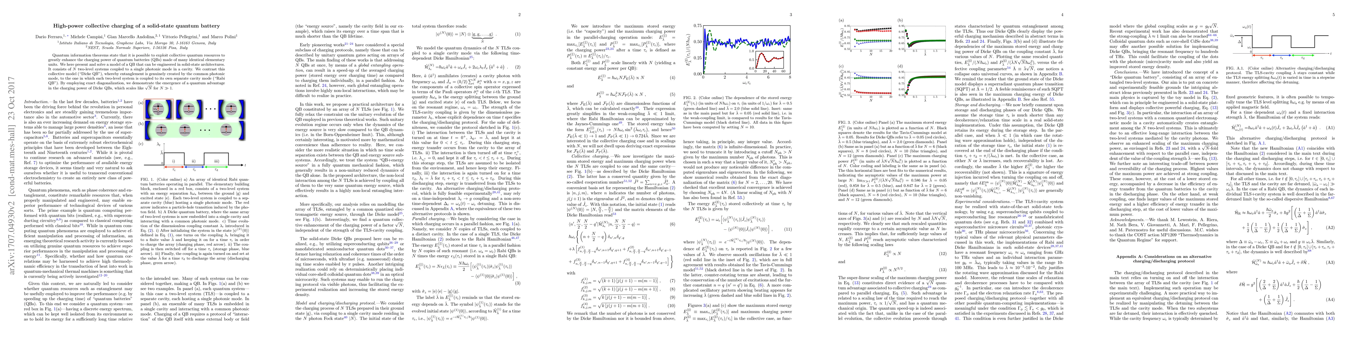 This paper explores a high-power collective charging method for a solid-state quantum battery using quantum information theorems. It contrasts a "Dicke QB" model, where entanglement enhances charging power, with a "Rabi QB" model, showing a quantum advantage in the former that scales with $\sqrt{N}$ for large $N$.