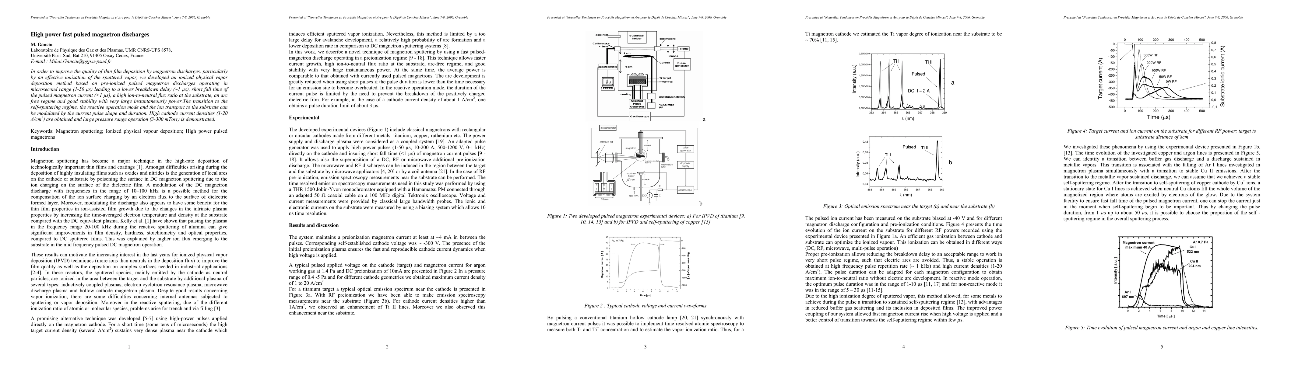 In order to improve the quality of thin film deposition by magnetron discharges, particularly by an effective ionization of the sputtered vapor, we developed an ionized physical vapor deposition method based on pre-ionized pulsed magnetron discharges operating in microsecond range (1-50 microseconds) leading to a lower breakdown delay, short fall time of the pulsed magnetron current, lower than one microsecond, a high ion-to-neutral flux ratio at the substrate, an arc free regime and good stability with very large instantaneously power.The transition to the self-sputtering regime, the reactive operation mode and the ion transport to the substrate can be modulated by the current pulse shape and duration. High cathode current densities (1-20 A/cm2) are obtained and large pressure range operation (3-300 mTorr) is demonstrated.