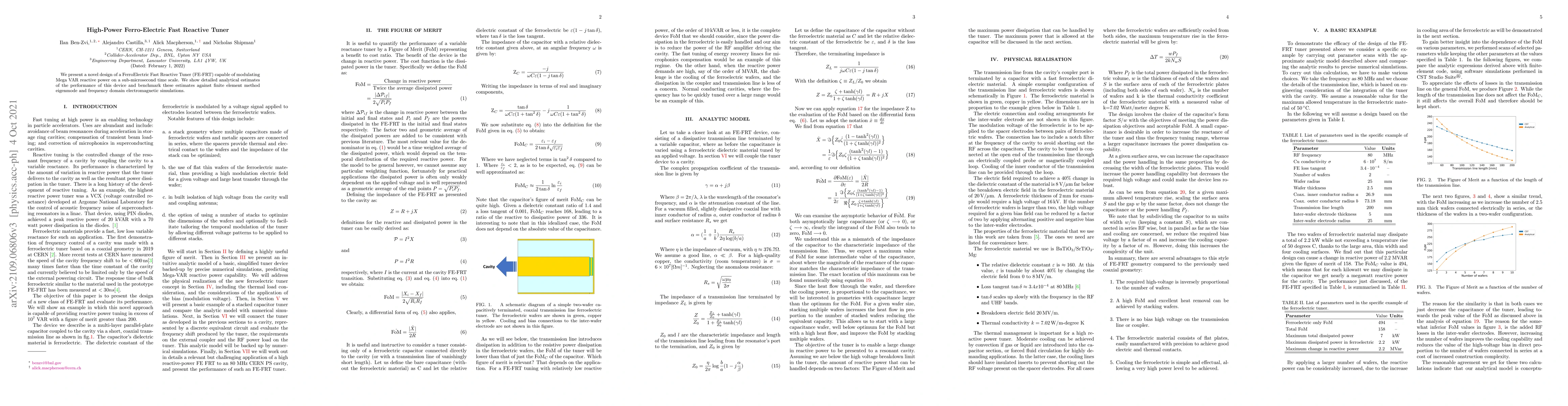 We present a novel design of a FerroElectric Fast Reactive Tuner (FE-FRT) capable of modulating Mega VAR reactive power on a sub-microsecond time scale. We show detailed analytical estimates of the performance of this device and benchmark these estimates against finite element method eigenmode and frequency domain electromagnetic simulations.