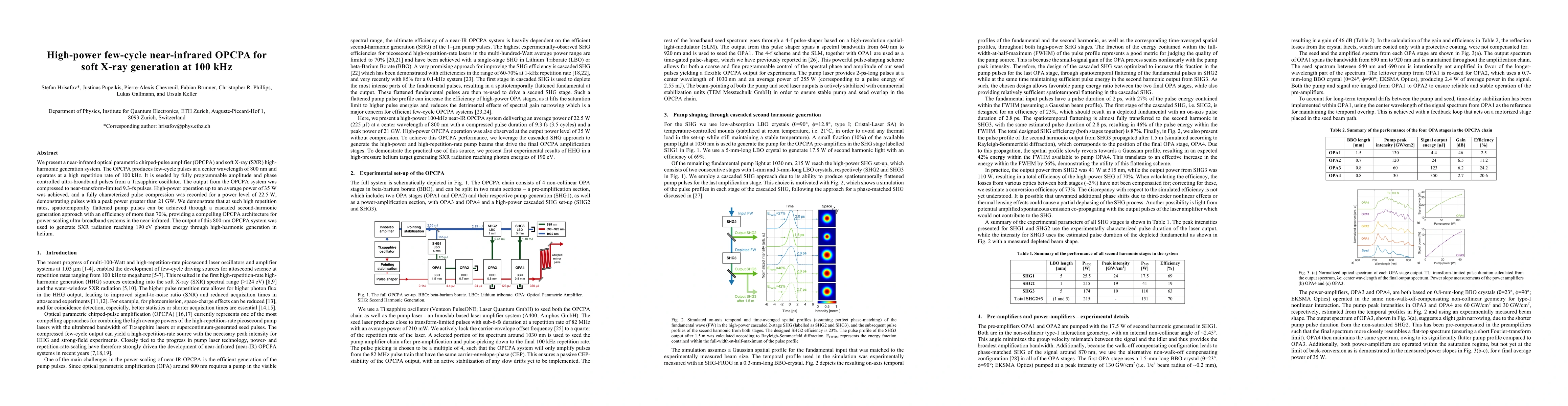This paper details a high-power few-cycle near-infrared optical parametric chirped-pulse amplifier (OPCPA) operating at 100 kHz, achieving average power of 35 W and peak power over 21 GW. The system generates 9.3-fs pulses and produces soft X-ray radiation up to 190 eV via high-harmonic generation in helium.