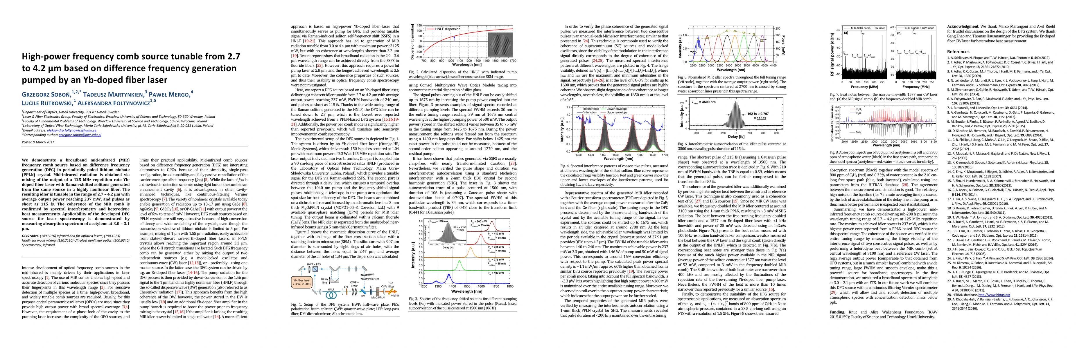 This paper presents a broadband mid-infrared frequency comb source tunable from 2.7 to 4.2 μm using difference frequency generation in a PPLN crystal, pumped by a Yb-doped fiber laser. The system achieves an average output power of 237 mW and pulses as short as 115 fs, demonstrating potential for laser spectroscopy applications.