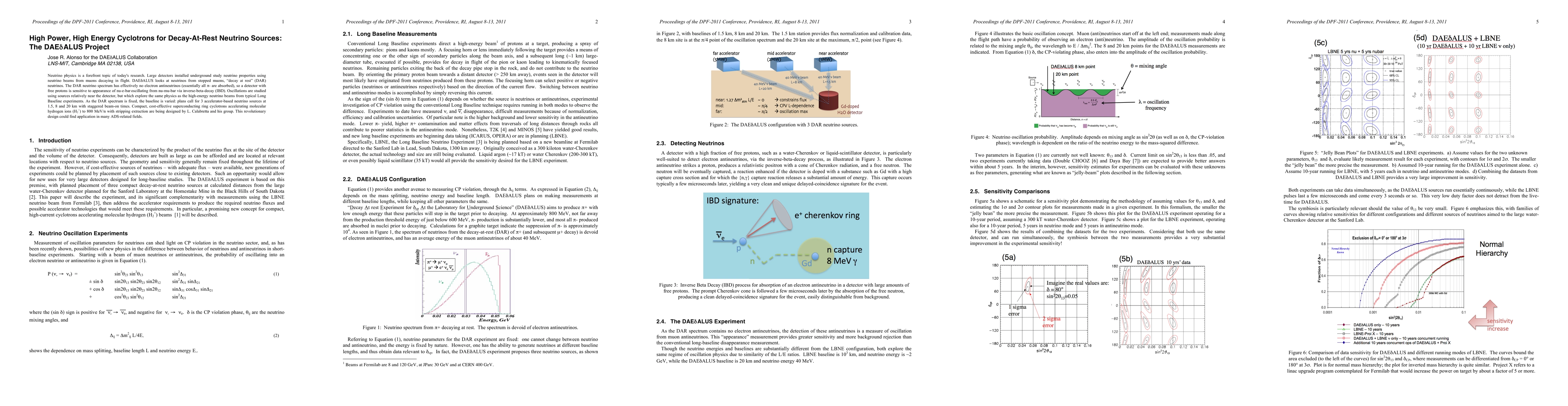 Neutrino physics is a forefront topic of today's research. Large detectors installed underground study neutrino properties using neutrino beams from muons decaying in flight. DAEdALUS looks at neutrinos from stopped muons, "decay at rest" (DAR) neutrinos. The DAR neutrino spectrum has effectively no electron antineutrinos (essentially all pi- are absorbed), so a detector with free protons is sensitive to appearance of nu-e-bar oscillating from nu-mu-bar via inverse-beta-decay (IBD). Oscillations are studied using sources relatively near the detector, but which explore the same physics as the high-energy neutrino beams from Long Baseline experiments. As the DAR spectrum is fixed, the baseline is varied: plans call for 3 accelerator-based neutrino sources at 1.5, 8 and 20 km with staggered beam-on times. Compact, cost-effective superconducting ring cyclotrons accelerating molecular hydrogen ions (H2+) to 800 MeV/n with stripping extraction are being designed by L. Calabretta and his group. This revolutionary design could find application in many ADS-related fields.