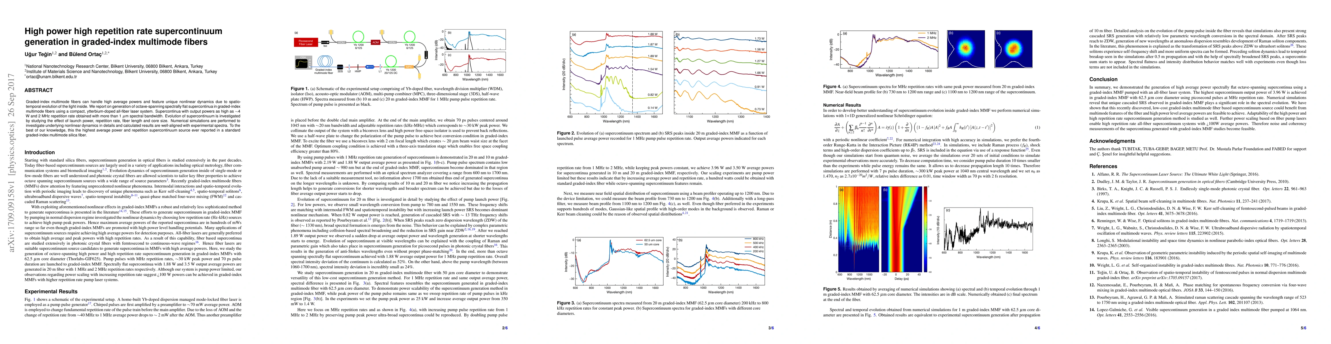 This research demonstrates the generation of high power, high repetition rate supercontinua in graded-index multimode fibers using a compact ytterbium-doped laser system, achieving up to 4 W output power and 2 MHz repetition rate. The study investigates the effects of various parameters on supercontinuum evolution and aligns numerical simulations with experimental results.