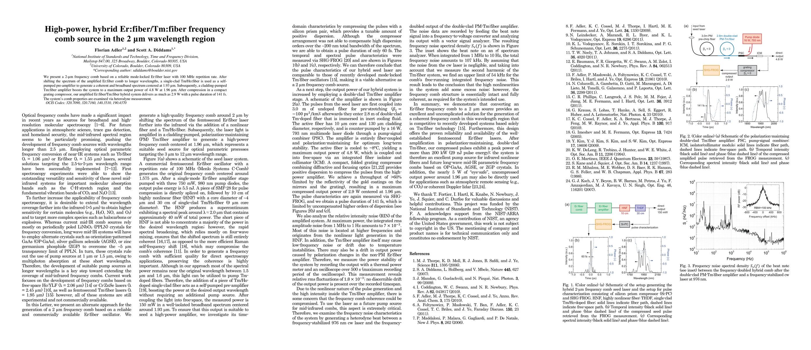 This paper describes a high-power, hybrid Er:fiber/Tm:fiber laser frequency comb source operating at 2 μm, achieving a maximum output power of 4.8 W. The system utilizes a mode-locked Er:fiber laser, followed by a Tm/Ho:fiber pre-amplifier and a cladding-pumped Tm:fiber amplifier, culminating in a compressed pulse duration of 141 fs and a final output power of 2.9 W.