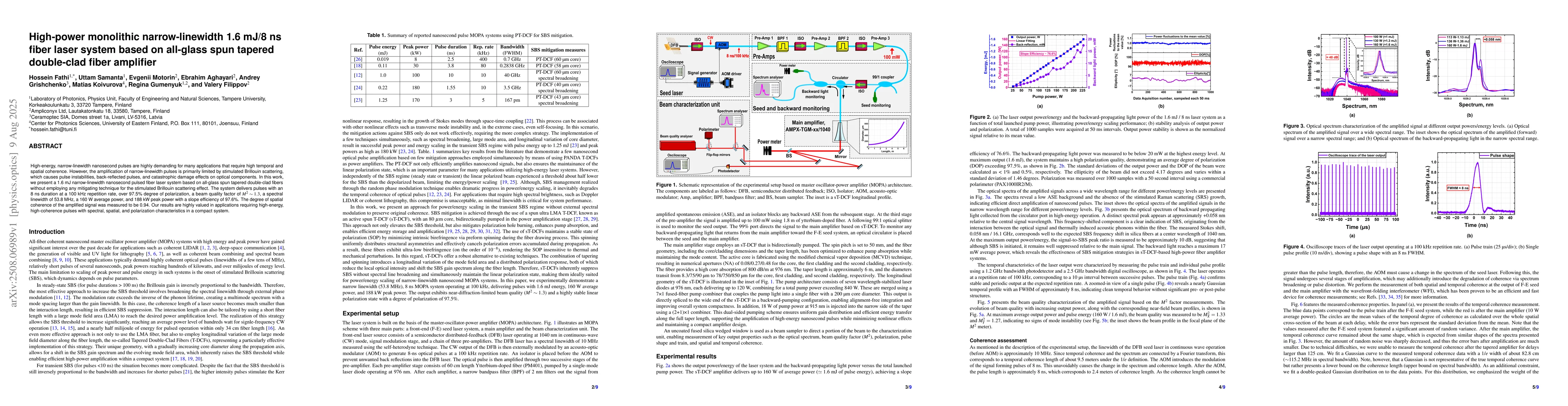 High-energy, narrow-linewidth nanosecond pulses are highly demanding for many applications that require high temporal and spatial coherence. However, the amplification of narrow-linewidth pulses is primarily limited by stimulated Brillouin scattering, which causes pulse instabilities, back-reflected pulses, and catastrophic damage effects on optical components. In this work, we present a 1.6 mJ narrow-linewidth nanosecond pulsed fiber laser system based on all-glass spun tapered double-clad fibers without employing any mitigating technique for the stimulated Brillouin scattering effect. The system delivers pulses with an 8 ns duration at a 100 kHz repetition rate, over 97.5% degree of polarization, a beam quality factor of M2 = 1.3, a spectral linewidth of 53.8 MHz, a 160 W average power, and 188 kW peak power with a slope efficiency of 97.6%. The degree of spatial coherence of the amplified signal was measured to be 0.94. Our results are highly valued in applications requiring high-energy, high-coherence pulses with spectral, spatial, and polarization characteristics in a compact system.