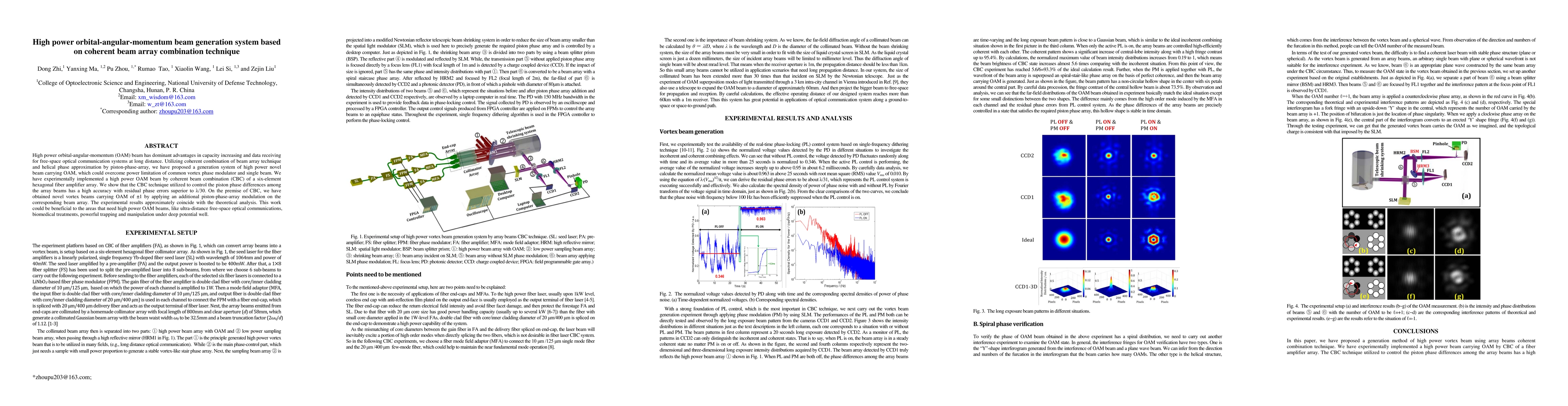 This paper proposes a high power orbital-angular-momentum (OAM) beam generation system using coherent beam array combination (CBC) technique, overcoming power limitations of traditional vortex phase modulators. Experimental results demonstrate high accuracy and effective generation of high power OAM beams, which are beneficial for long-distance optical communications and other applications requiring powerful OAM beams.