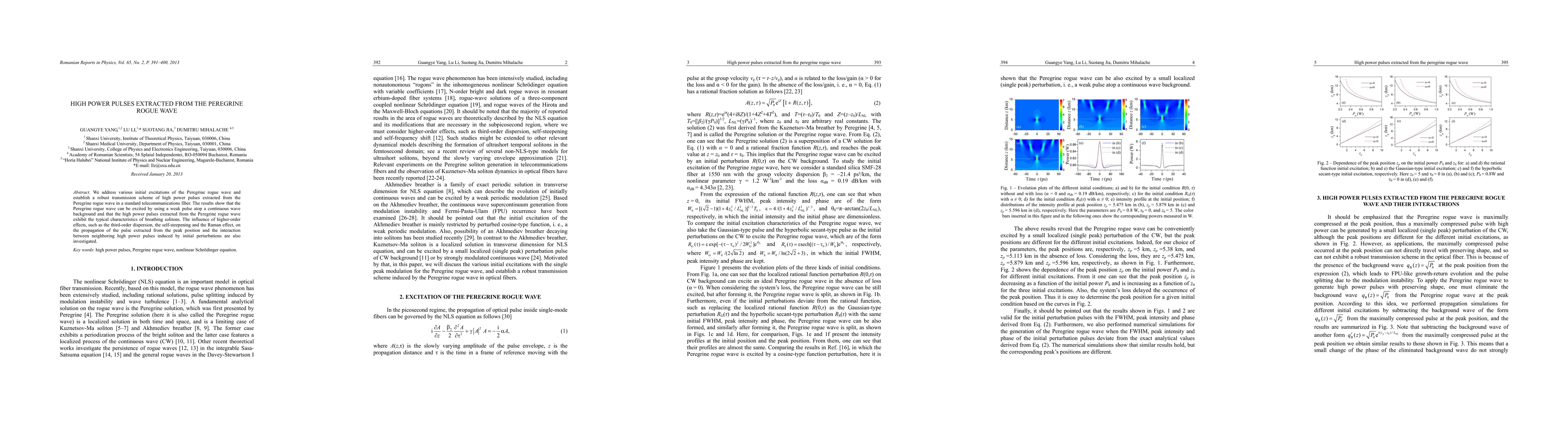 The paper presents a theoretical framework for exciting and utilizing Peregrine rogue waves to generate high power pulses with robust transmission characteristics in optical fibers.