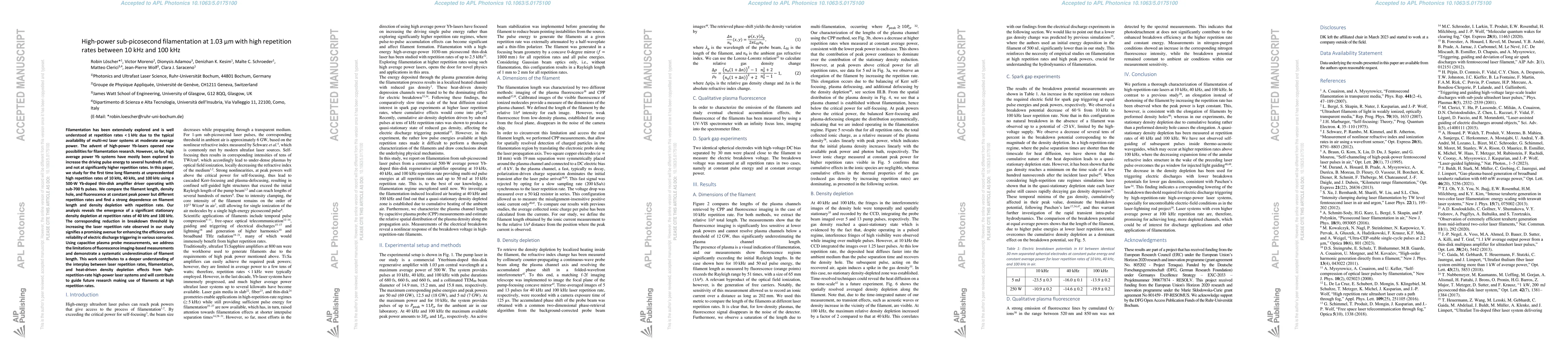 This paper investigates high-power sub-picosecond filamentation at 1.03 μm using high-repetition-rate Yb-laser systems, finding significant variations in filament length and density depletion with increasing repetition rates. The study highlights the potential for enhanced efficiency in electric discharge triggering at high repetition rates.