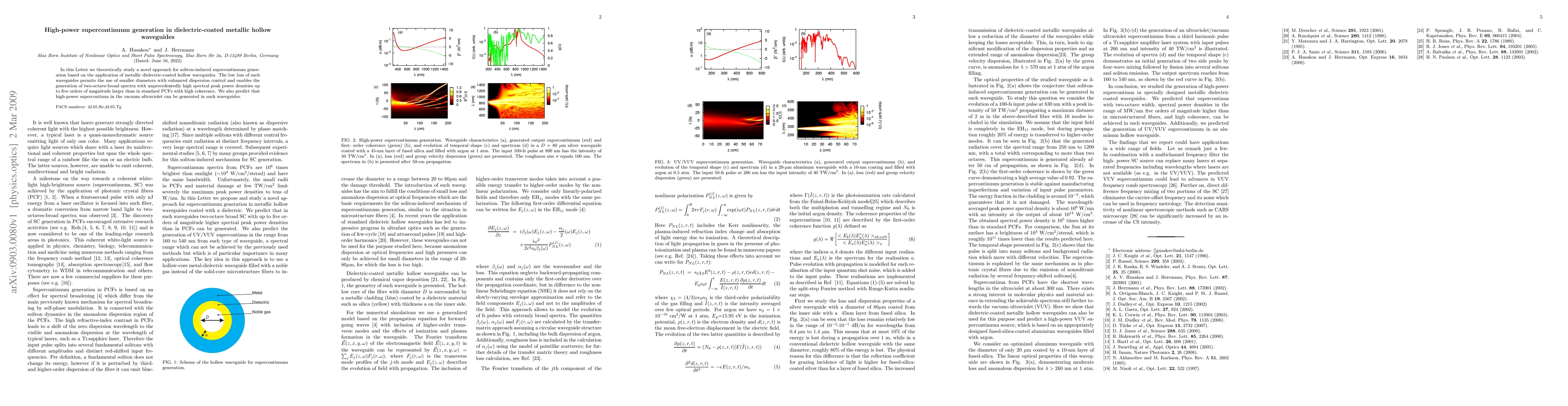 This paper proposes a novel method for generating high-power supercontinua using dielectric-coated metallic hollow waveguides, achieving two-octave-broad spectra with significantly higher peak power densities compared to standard photonic crystal fibers. The study also predicts the potential for generating supercontinua in the vacuum ultraviolet.