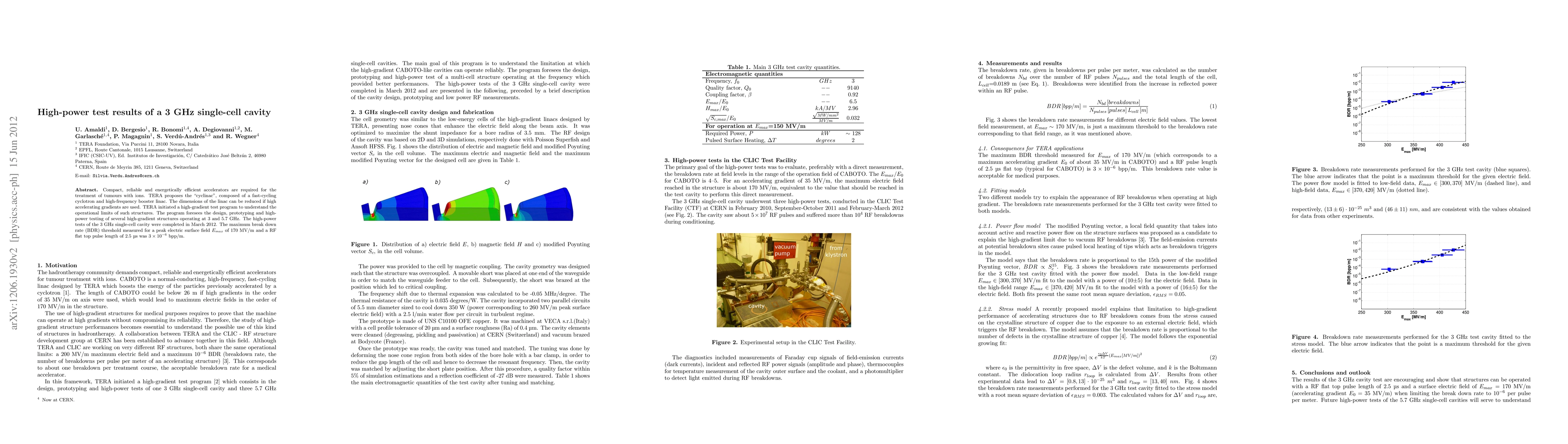 Researchers tested a 3 GHz single-cell cavity accelerator for ion cancer treatment, achieving a maximum electric field of 170 MV/m before breakdown.