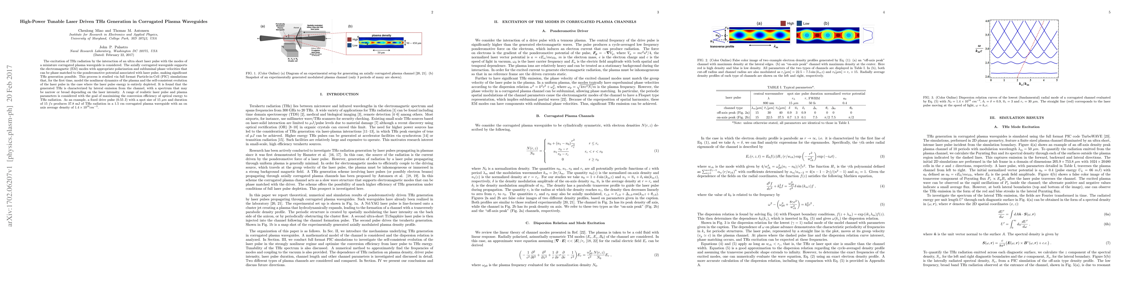 This paper investigates the generation of THz radiation via ultra-short laser pulses interacting with corrugated plasma waveguides, achieving high-power, tunable THz emission through nonlinear dynamics modeled by Particle-in-Cell simulations. The study finds that the waveguide's EM modes enable efficient, tunable THz generation with a spectrum dependent on laser intensity.