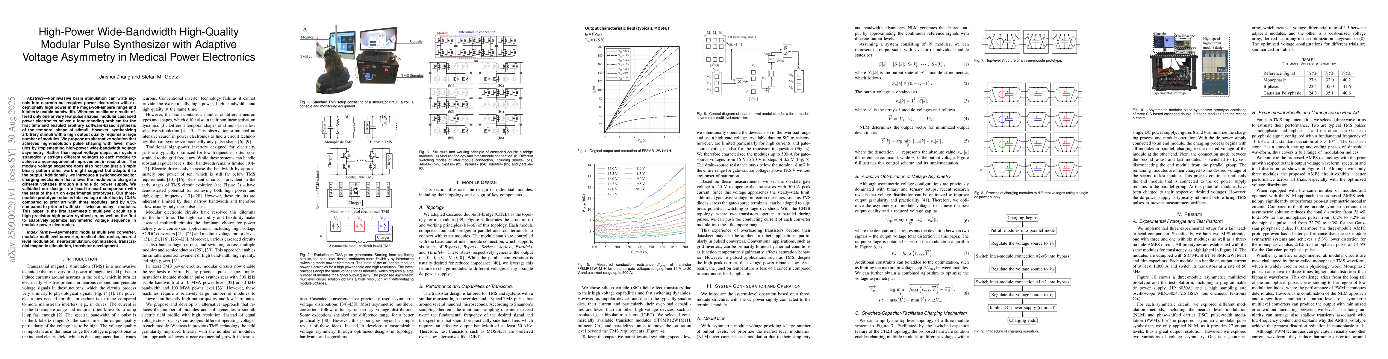 Noninvasive brain stimulation can write signals into neurons but requires power electronics with exceptionally high power in the mega-volt-ampere range and kilohertz usable bandwidth. Whereas oscillator circuits offered only one or very few pulse shapes, modular cascaded power electronics solved a long-standing problem for the first time and enabled arbitrary software-based synthesis of the temporal shape of stimuli. However, synthesizing arbitrary stimuli with a high output quality requires a large number of modules. We propose an alternative solution that achieves high-resolution pulse shaping with fewer modules by implementing high-power wide-bandwidth voltage asymmetry. Rather than equal voltage steps, our system strategically assigns different voltages to each module to achieve a near-exponential improvement in resolution. The module voltage sequence does also not use just a simple binary pattern other work might suggest but adapts it to the output. Additionally, we introduce a switched-capacitor charging mechanism that allows the modules to charge to different voltages through a single dc power supply. We validated our design in a head-to-head comparison with the state of the art on experimental prototypes. Our three-module prototype reduces total voltage distortion by 13.4% compared to prior art with three modules, and by 4.5% compared to prior art with six -- twice as many -- modules. This paper is the first asymmetric multilevel circuit as a high-precision high-power synthesizer, as well as the first to adaptively optimize asymmetric voltage sequence in modular power electronics.
