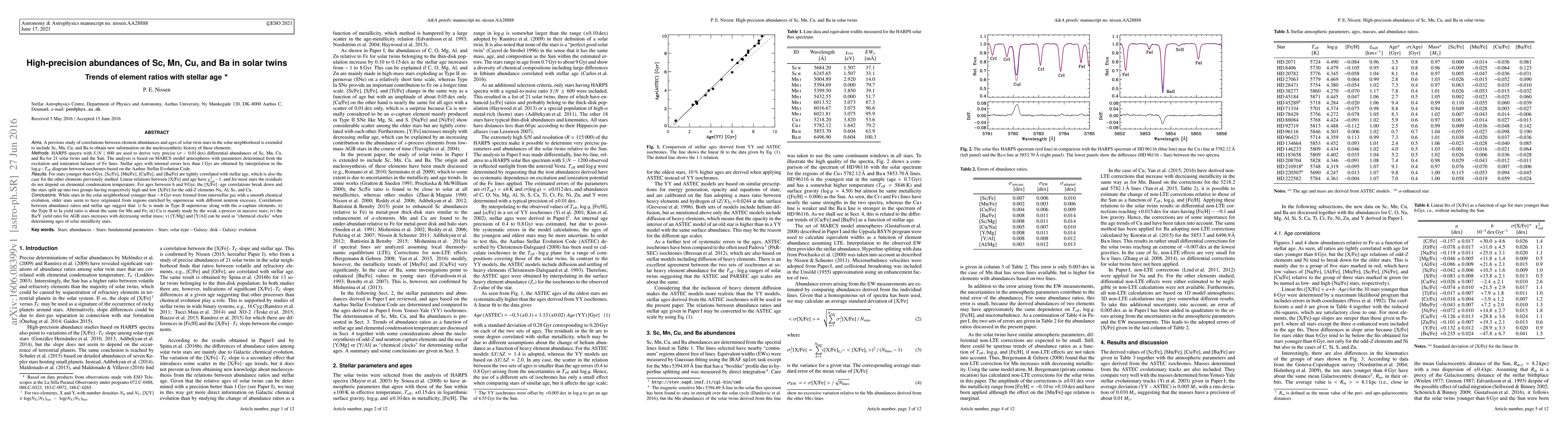 This paper investigates high-precision abundances of Sc, Mn, Cu, and Ba in solar twin stars, finding correlations between [X/Fe] ratios and stellar age. For stars younger than 6 Gyr, [X/Fe] correlates strongly with age, while for older stars, the correlation breaks down, suggesting different neutron capture processes in older stellar populations.