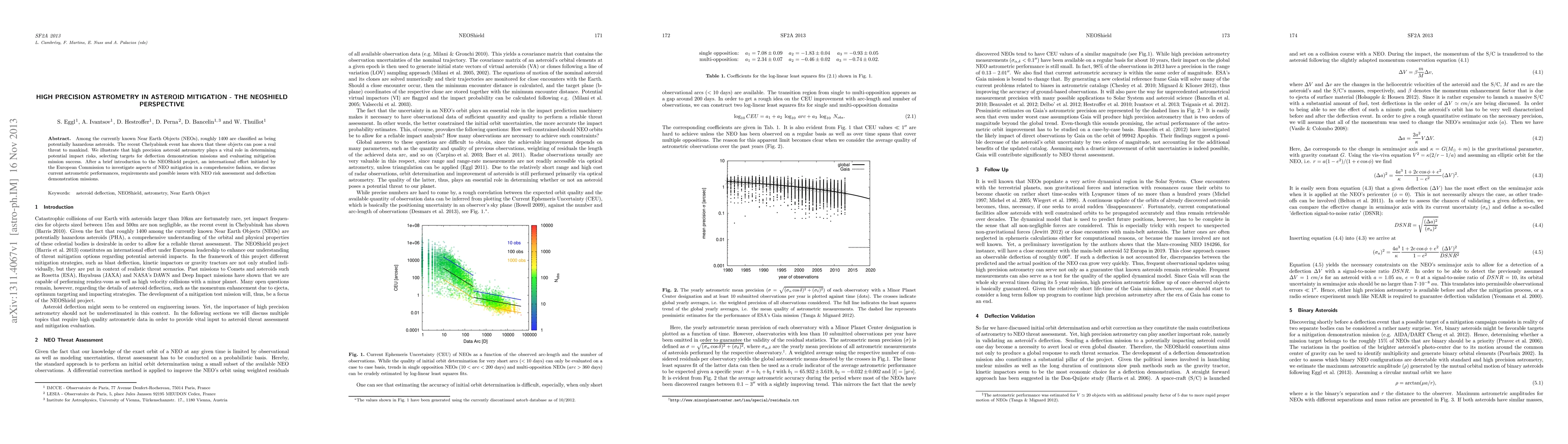 This paper discusses the importance of high precision astrometry in assessing and mitigating the threat posed by potentially hazardous Near Earth Objects (NEOs), emphasizing its role in determining impact risks and guiding deflection missions within the NEOShield project. It also reviews current astrometric capabilities and challenges in NEO risk assessment and deflection demonstration missions.