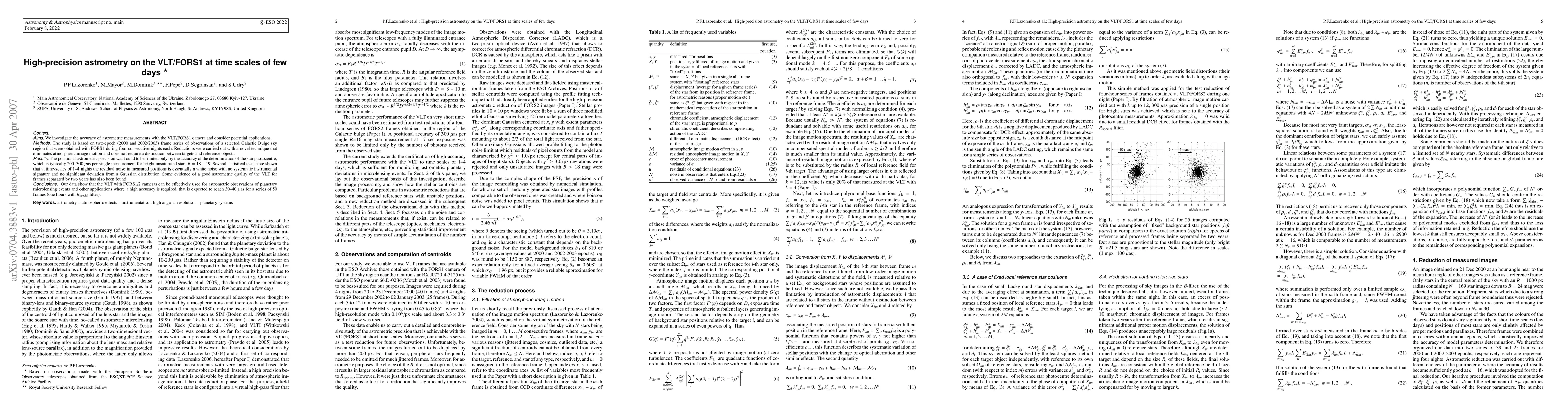 This study achieves high-precision astrometry with VLT/FORS1, reaching 200-300 microarcsec per measurement for bright stars. The novel reduction technique eliminates atmospheric distortions, confirming white noise residuals and Gaussian distribution. The VLT/FORS1 cameras are deemed suitable for precise astrometric observations, including planetary microlensing events, with potential accuracy of 30-40 microarcsec in short observation series.