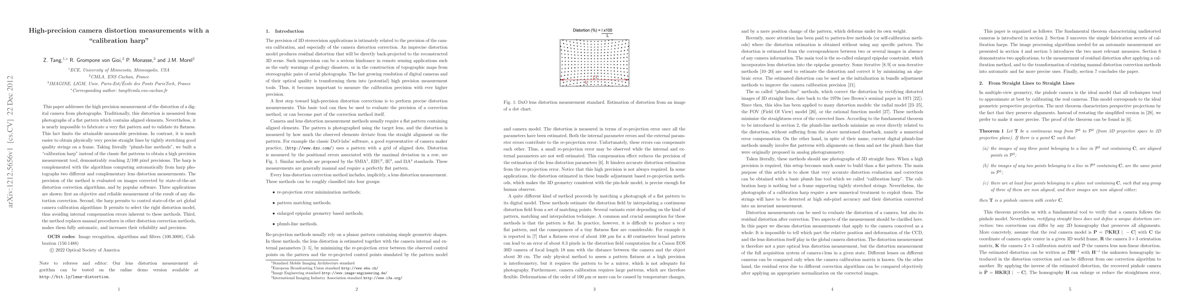 This paper introduces a "calibration harp" for high-precision digital camera distortion measurement, replacing traditional flat patterns due to their fabrication limitations. The harp, with its precisely straight lines, achieves 2/100 pixel precision and automates distortion measurement, demonstrating applications in evaluating distortion correction results and improving camera calibration algorithms.