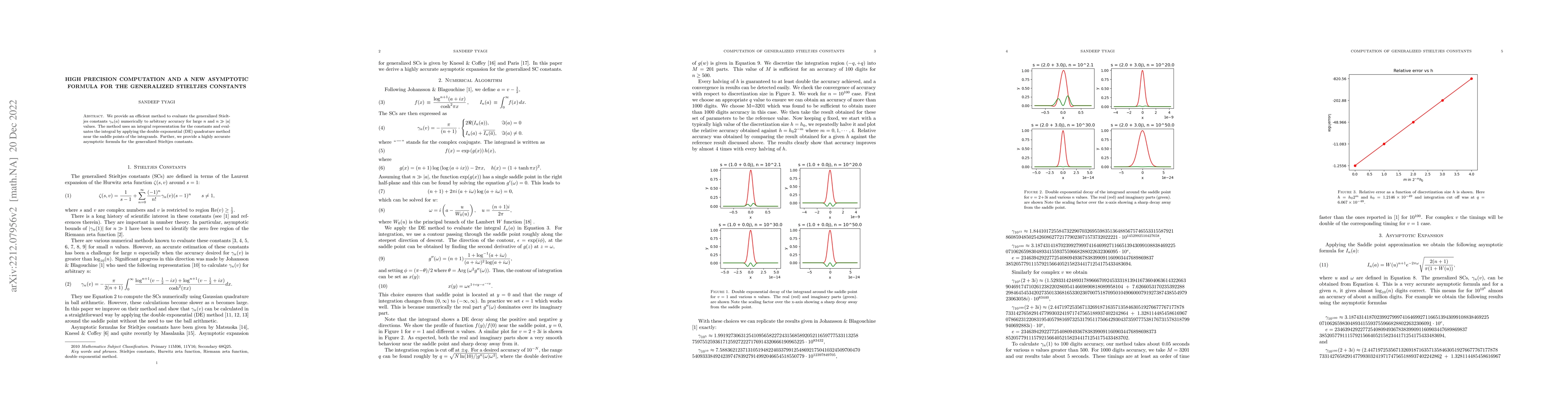 This paper presents a precise numerical method for evaluating generalized Stieltjes constants $\gamma_n(a)$ using double exponential quadrature and provides an accurate asymptotic formula for large $n$ and $n \gg |a|$.