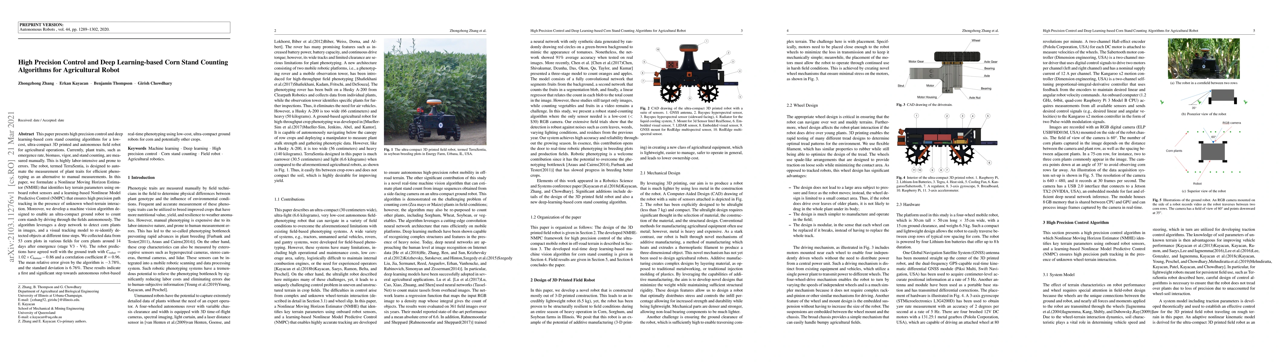 This paper introduces high precision control and deep learning algorithms for an autonomous agricultural robot, TerraSentia, to automate corn stand counting. The robot employs a Nonlinear Moving Horizon Estimator and a Nonlinear Model Predictive Control for precise navigation, and a deep learning-based machine vision algorithm for accurate corn stand detection, achieving a mean relative error of -3.78% and a correlation coefficient of 0.96 with human counts.