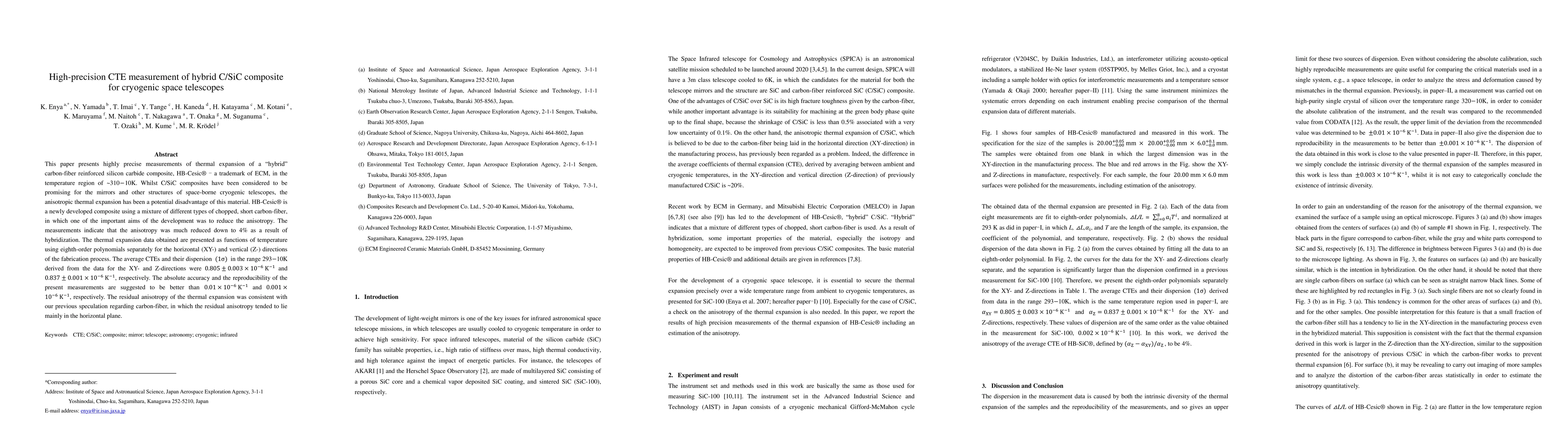 This paper reports highly precise thermal expansion measurements for the hybrid C/SiC composite HB-Cesic®, showing reduced anisotropy down to 4%. The average CTEs in the XY- and Z-directions were 0.805±0.003×10⁻⁶ K⁻¹ and 0.837±0.001×10⁻⁶ K⁻¹, respectively, with high measurement accuracy and reproducibility.