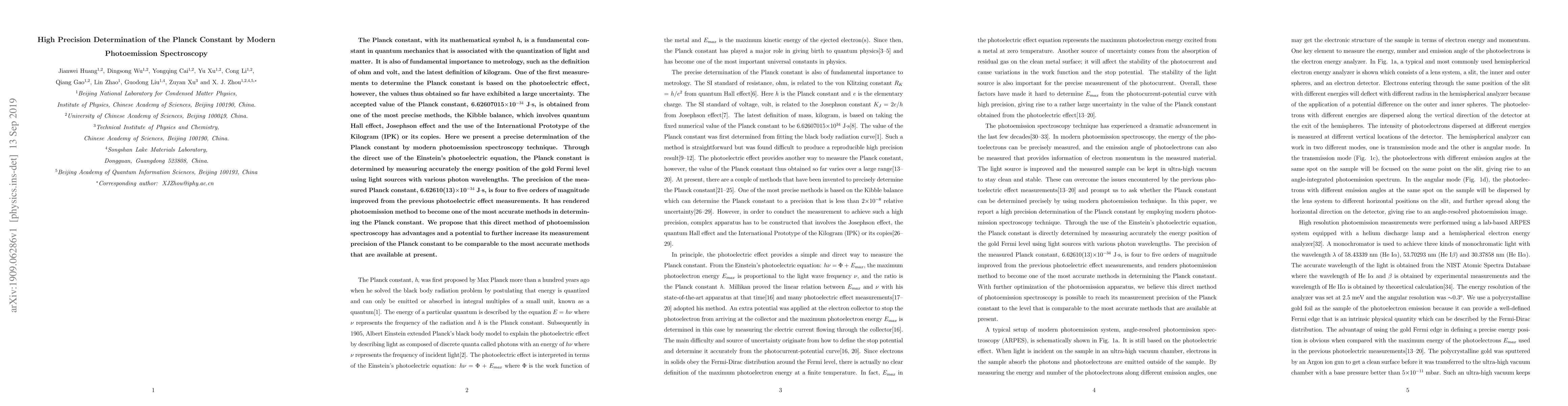 This paper presents a high-precision determination of the Planck constant using modern photoemission spectroscopy, achieving a significant improvement in accuracy over previous photoelectric effect measurements. The new value, 6.62610(13)×10^-34 J·s, positions photoemission spectroscopy as a highly accurate method for determining the Planck constant.