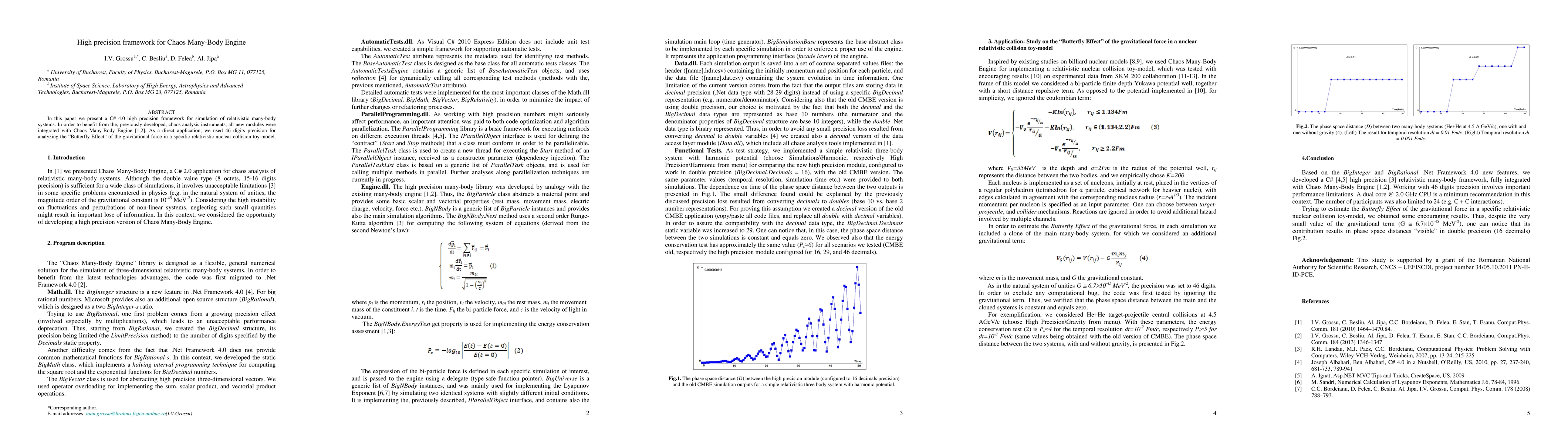 In this paper we present a C# 4.0 high precision framework for simulation of relativistic many-body systems. In order to benefit from, previously developed, chaos analysis instruments, all new modules were designed to be integrated with Chaos Many-Body Engine [1,3]. As a direct application, we used 46 digits precision for analyzing the Butterfly Effect of the gravitational force in a specific relativistic nuclear collision toy-model. Trying to investigate the average Lyapunov Exponent dependency on the incident momentum, an interesting case of intermittency was noticed. Based on the same framework, other high-precision simulations are currently in progress (e.g. study on the possibility of considering, hard to detect, extremely low frequency photons as one of the dark matter components).